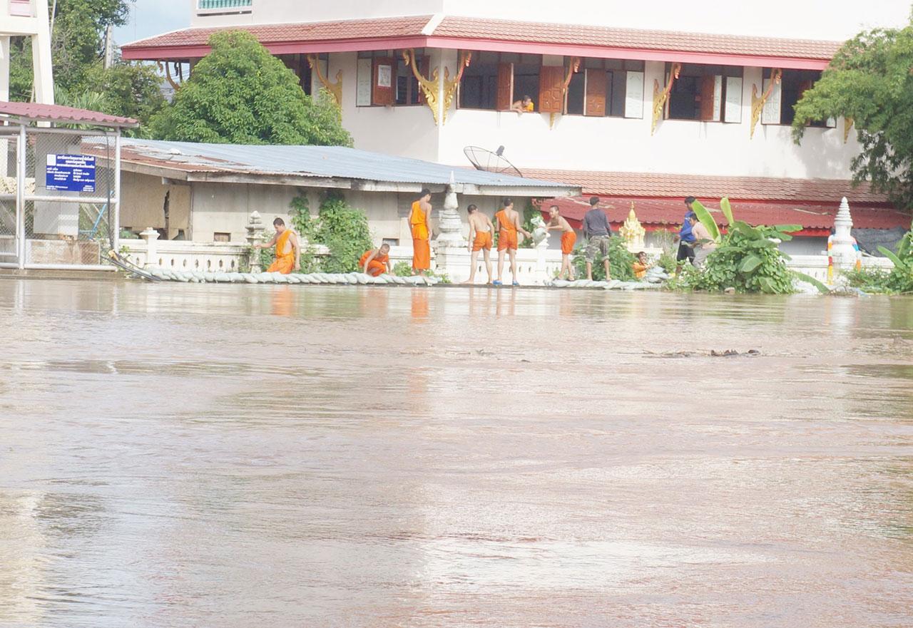 นอกจากนี้ ที่ถนนวิเชียรจำนงค์ ระดับน้ำที่ท่วมขังยังคงทรงตัวอยู่ที่ประมาณ 30-40 ซม. ชาวบ้านกว่า 500 หลังคาเรือน ได้รับความเดือดร้อน จากสถานการณ์น้ำยมไหลทะลักเข้าท่วมในครั้งนี้ ส่วนบริเวณหลังวัดราชธานี ต.ธานี ซึ่งอยู่ติดกับแม่น้ำยมไหลผ่าน มีพระและสามเณร ออกมาช่วยกันขนกระสอบทรายวางเสริมขึ้นให้สูงกว่าเดิมอีก 3 ชั้น เนื่องจากทางเทศบาลเมืองสุโขทัยธานี ได้ออกประกาศเตือนว่า จะมีพายุดีเปรสชันเคลื่อนตัวจากประเทศเวียดนามเข้าสู่ภาคเหนือและภาคตะวันออกเฉียงเหนือของประเทศไทย ในช่วงวันที่ 17-19 กย. และอาจจะมีฝนตกหนักในพื้นที่ ส่งผลต่อระดับน้ำในแม่น้ำยมให้เพิ่มสูงขึ้นอย่างรวดเร็ว.
