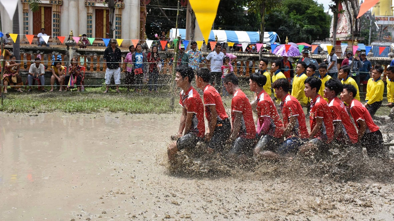 การแข่งขันเรือบก อุปกรณ์หลักคือไม้ไผ่ ความยาว 8 ศอก แต่ละทีมมีผู้แข่งขัน 9 คน ระยะทางการแข่งขันความยาว 100 เมตร ปีนี้มีหมู่บ้านต่างๆ ส่งทีมเข้าร่วมแข่งขันจำนวนมาก แบ่งการแข่งขันออกเป็น 3 รุ่น ในประเภทชาย-หญิง ได้แก่ รุ่นเล็ก ระดับประถม รุ่นกลาง ระดับมัธยม และรุ่นใหญ่ เปิดโอเพ่น บรรยากาศการแข่งขันในรอบคัดเลือกตั้งแต่เช้าเต็มไปด้วยความสนุกสนาน ที่สนามแข่งขันระยะทาง 100 เมตร ทางผู้จัดได้นำน้ำมาหล่อเลี้ยงให้แฉะในสภาพเจิ่งด้วยน้ำและโคลน มีกรรมการที่จุดปล่อยและจุดเข้าเส้นชัย แต่ละทีมจะลงแข่งในกติกาเหมือนแข่งขันเรือยาว ต้องชนะ 2 ใน 3 ทีมใดล้มก่อนถึงเส้นชัย ถือว่าแพ้ทันที โดยมีชาวบ้านส่งเสียงเชียร์ในแต่ละทีมอย่างสนุกสนาน.