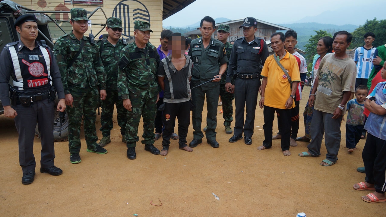 ทหารชุดปราบปรามยาเสพติดภาคเหนือ ร่วมกับชาวบ้านล่าตัวหนุ่มชาวเขา ที่ฆ่าเมียกับลูกสาว 2 ศพ คาหมู่บ้านใน อ.ไชยปราการ จ.เชียงใหม่ เหตุจากเสพยาจนคลุ้มคลั่ง แล้วหนีเข้าป่า จนสามารถจับตัวได้ นำส่งตำรวจดำเนินคดี...