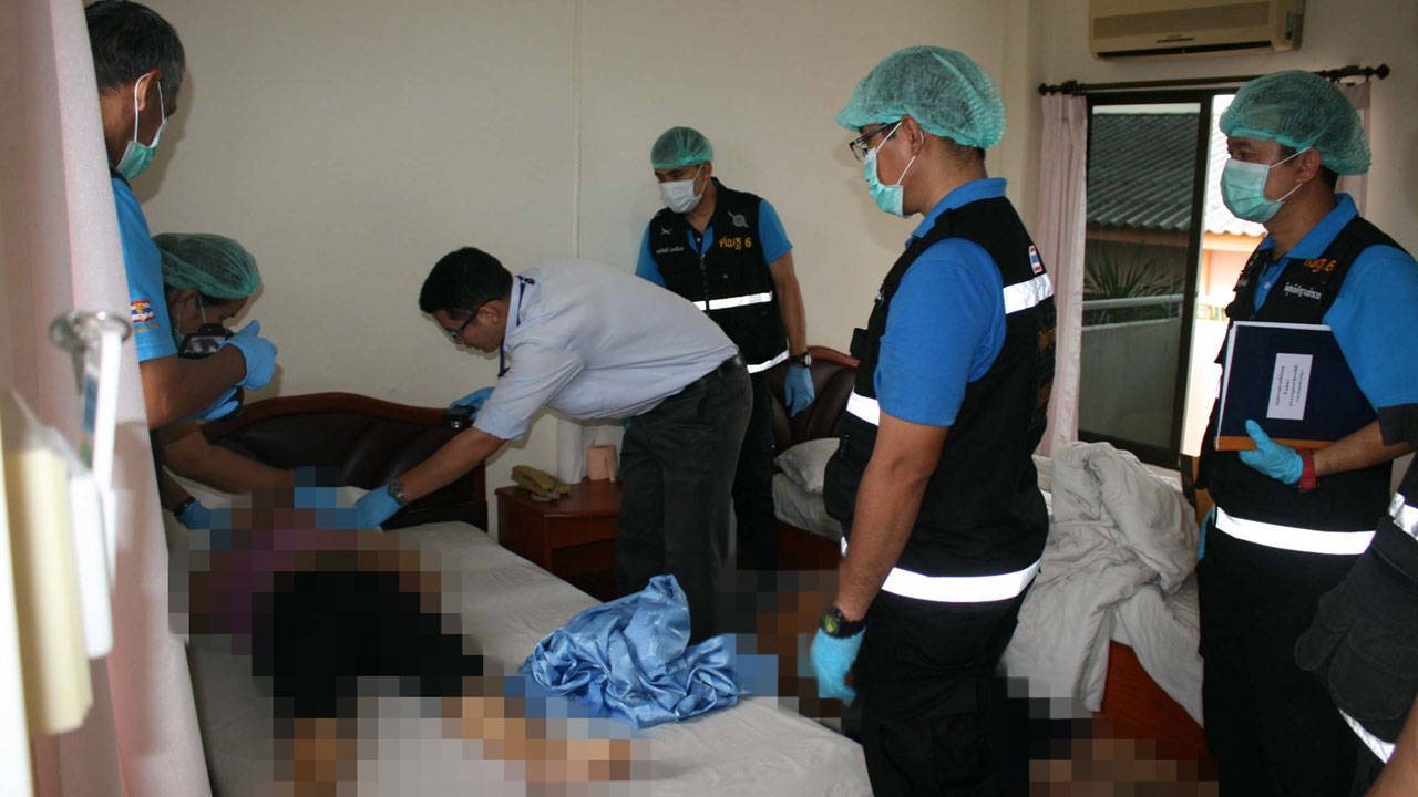 ส่วนศพนางพิมลพรรณ นอนหงายเสียชีวิตอยู่บนเตียงนอนติดประตูทางเข้าห้องพัก มีผ้าห่มสีฟ้าคลุมทั้งร่าง สภาพศพสวมเสื้อเชิ้ตลายดอกสีแดงพื้นสีขาว ใส่กางเกงขาสามส่วนสีดำ ทั้งสองศพไม่มีร่องรอยบาดแผลถูกทำร้ายร่างกาย คาดว่าทั้งคู่เสียชีวิตมาแล้วไม่ต่ำกว่า 8 ชั่วโมง