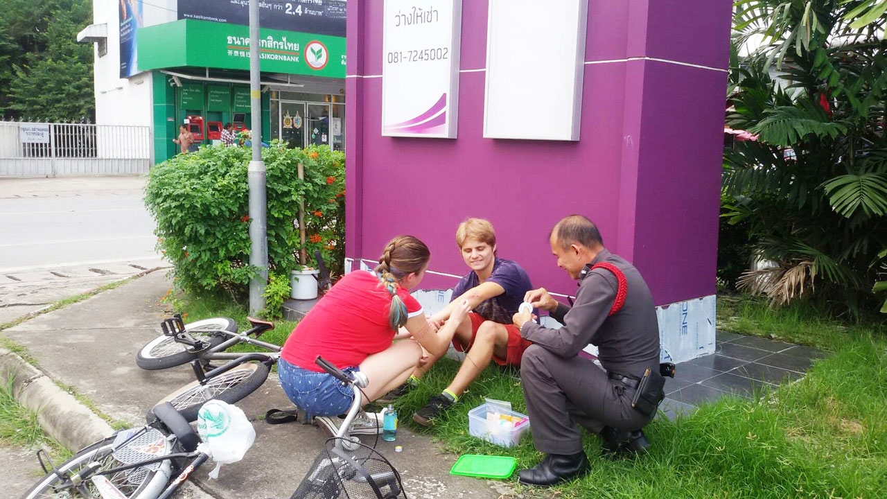 ร.ต.ท.เอนก ศรีนวล รอง สวป.สภ.สันกำแพงทำหน้าที่หัวหน้าตู้ยามข่วง อ.สันกำแพง จ.เชียงใหม่ ได้ขี่ จยย.ผ่านมาพบเห็นนักท่องเที่ยวต่างชาติ 2 คน ชายและหญิงซึ่งปั่นจักรยาน 2 ล้อมาจากเมืองเชียงใหม่ และหกล้มได้รับบาดเจ็บที่บริเวณสี่แยกไฟแดง “ข่วง” ถนนสายวัฒนธรรมสันกำแพง-เชียงใหม่ บ้านสันกำแพง หมู่ 8 ต.สันกำแพง อ.สันกำแพง เมื่อสายวันที่ 24 ก.ย. เข้าไปช่วยเหลือนักท่องเที่ยวฝรั่งชาย 1 คน นำมาทำบาดแผลให้ซึ่งได้รับบาดเจ็บถลอกตามร่างกาย โดยได้ปฐมพยาบาลในเบื้องต้นใส่ยาให้จนเป็นที่เรียบร้อย นักท่องเที่ยวชาวต่างชาติชายหญิง 2 คน ได้กล่าวขอบคุณเจ้าหน้าที่ตำรวจไทย ที่มีน้ำใจงามช่วยเหลือในครั้งนี้ จากนั้นนักท่องเที่ยวทั้ง 2 คนได้เดินทางไปเที่ยวต่อไป