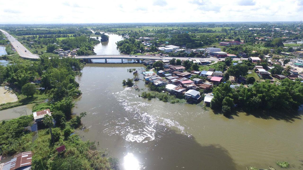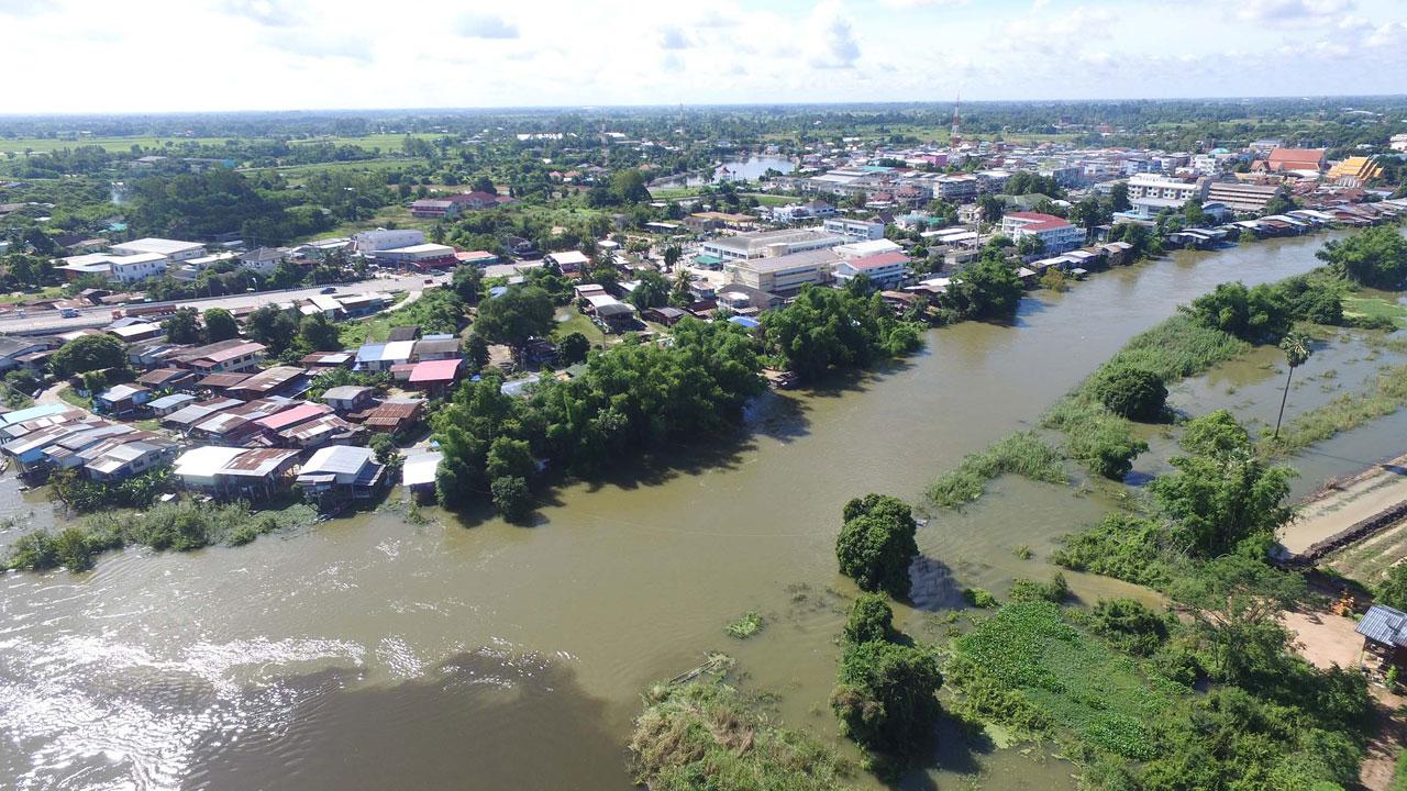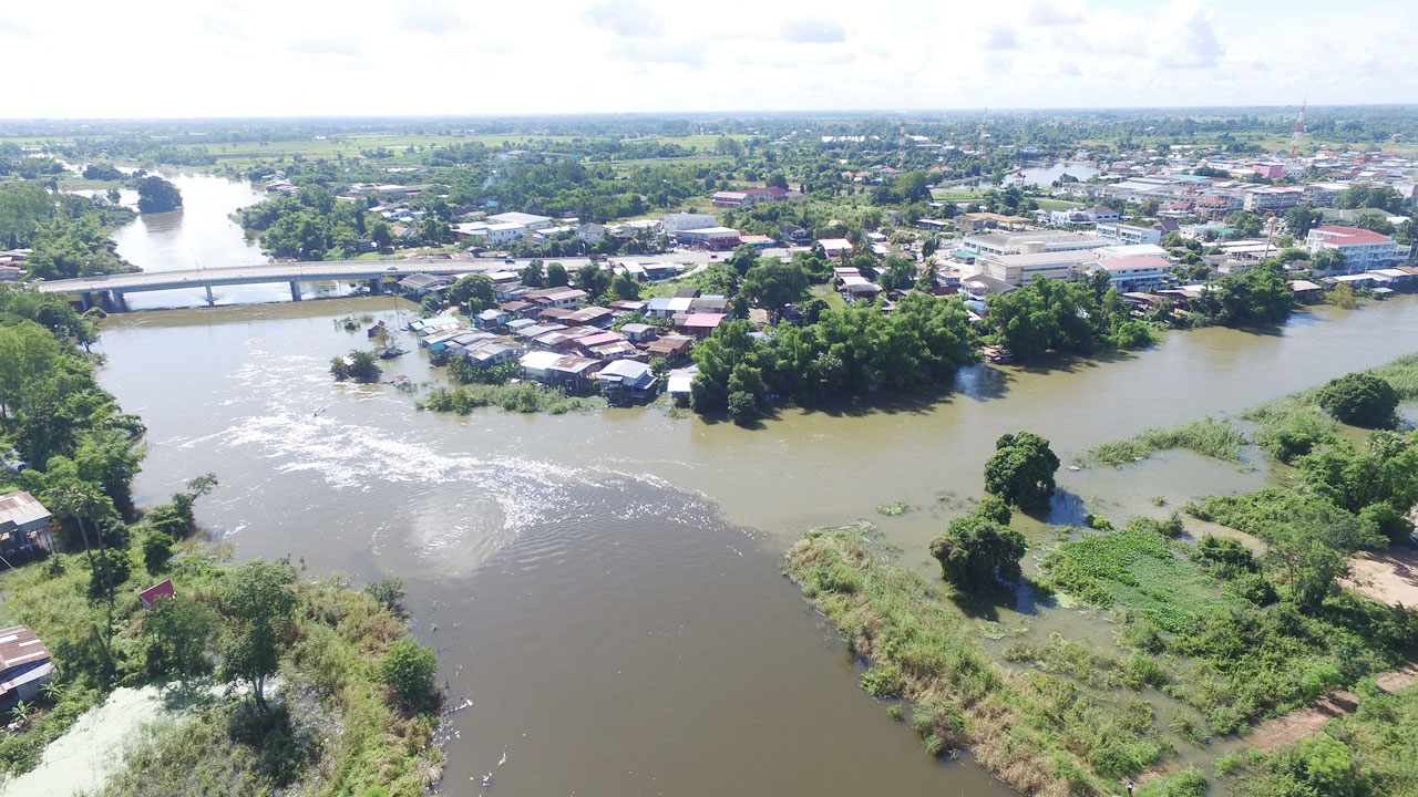 น้ำท่วมท่ีสองแคว แม่น้ำยมล้นตลิ่งที่ อ.พรหมพิราม อ.เมือง ส่วน อ.บางระกำ ระดับน้ำยังอยู่ต่ำกว่าครั้งน้ำท่วมใหญ่ปี 54 อีกมาก เกิดปรากฏการณ์แม่น้ำยมสองสี สายเก่าสายใหม่ไหลมาบรรจบกัน มองจากที่สูงเห็นความแตกต่างชัดเจน...
