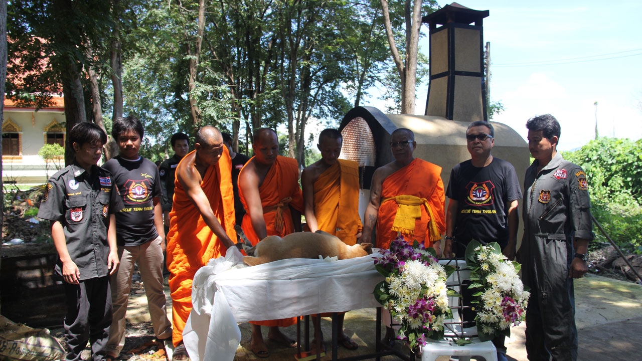 นายวชิระ นายกสมาคมกู้ภัยวัดหมอนไม้ กล่าวว่า เมื่อนำซากสุนัขที่ตายแล้วมาถึงก็จะนำมาวางไว้บนโต๊ะซึ่งปูด้วยผ้าสีขาว โดยมีพวงหรีดดอกไม้วางอยู่ด้านหน้าซากสุนัขที่ตายแล้ว เพื่อเตรียมทำพิธีเผา โดยมี พระครูเกษม ธรรมลังการ อาจารย์อุดร เจ้าคณะอำเภอเมืองอุตรดิตถ์ เจ้าอาวาสวัดหมอนไม้ พร้อมพระสงฆ์ในวัดอีก 4 รูป มาทำพิธีสวดมาติกาบังสุกุลให้กับสุนัขเพศเมียที่ตาย