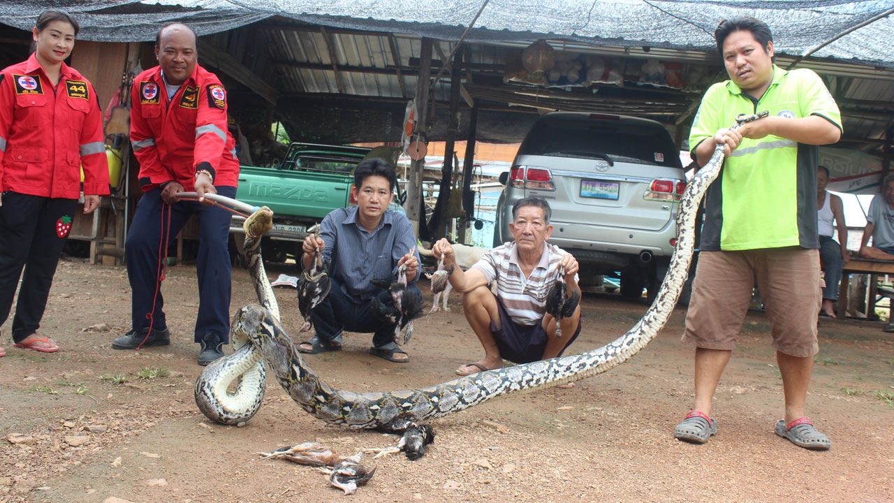 เจ้าของคอกไก่ชนที่ อ.ชนแดน เพชรบูรณ์ อยากจะร้องไห้ เจอซากไก่ตายเกลื่อน พร้อมตัวการคืองูเหลือมตัวใหญ่ยาวเกือบ 5 เมตร กำลังเขมือบไก่ลงท้อง กับที่รัดตายอีกรวม 10 ตัว บอกล้วนเป็นไก่ชนพม่าพันธุ์ดี ราคาแพงทั้งสิ้น...