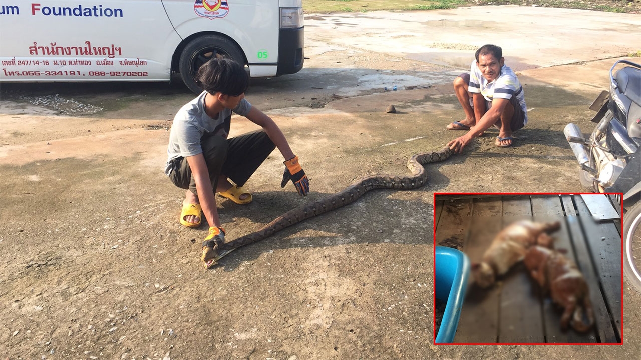 งูเหลือมที่พิษณุโลก หนีน้ำเข้าบ้านคน เลื้อยไปเจอกรงแมวที่เจ้าของเลี้ยงไว้ 2 ตัว พันธุ์เปอร์เซียขนปุย คาดหิวโซพังกรงเข้าไปรัดเขมือบลงท้องทั้งคู่ เจ้าของแจ้งกู้ภัยไปช่วยจับ งูขย้อนศพแมวออกมาพร้อมน้ำย่อยในกระเพาะ รีบมุดหนีลงรู...