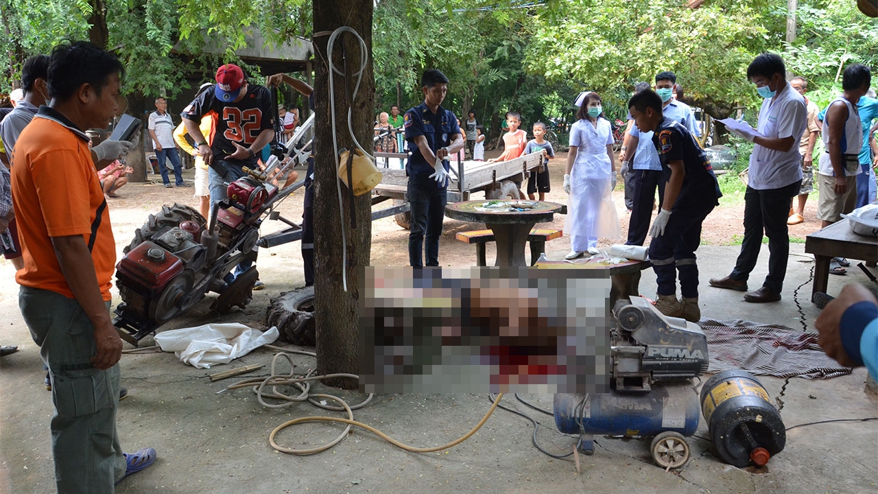 สอบสวนนางจันทร์ ไทยทองสุข อายุ 62 ปี พี่สาวภรรยาผู้ตาย ให้การว่า เมื่อตอนเช้าที่ผ่านมา น้องสาวตนได้ขึ้นรถตู้ไปหาลูกสาวที่ จ.ชลบุรี เพื่อจะไปช่วยเลี้ยงหลาน ฝ่ายน้องเขย คือ นายบุญรอด ขันกสิกรรม ผู้ตาย มีอาชีพทำนา เนื้อที่ 25 ไร่ และมีบ่อปลา 10 บ่อ ก่อนเกิดเหตุได้ขับรถไถไปหว่านปุ๋ยในนาข้าวแล้วกลับมาที่บ้านอาบน้ำนั่งกินส้มตำ จากนั้นได้ลงมือซ่อมแซมยางรถไถเดินตาม โดยนำปั๊มลมติดเครื่องอัดลมใส่ล้อข้างซ้าย คาดว่าเติมลมเข้าไปมาก ยางเบ่งจนกระทะล้อแยกออกจากกัน ก่อนจะมีเสียงดังคล้ายระเบิด จึงไปดูพบว่าเสียชีวิตแล้ว