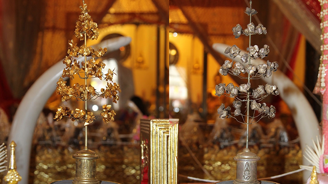 วันที่ 17 ต.ค. พระวินัยสาทร เจ้าคณะจังหวัดพิษณุโลก-อุตรดิตถ์ เจ้าอาวาสวัดพระแท่นศิลาอาสน์ พระอารามหลวง เปิดเผยว่า เมื่อครั้งพระบาทสมเด็จพระปรมินทรมหาภูมิพลอดุลยเดช เสด็จพระราชดำเนินทรงงานในพื้นที่ จ.อุตรดิตถ์ เมื่อวันที่ 17 มีนาคม 2501 พร้อมด้วยสมเด็จพระนางเจ้าสิริกิติ์ พระบรมราชินีนาถ ได้เสด็จมายัง วัดพระแท่นศิลาอาสน์ ต.ทุ่งยั้ง อ.ลับแล จ.อุตรดิตถ์ ซึ่งมีพระครูพุทธมัญจารักษ์ เป็นเจ้าอาวาสในขณะนั้น พระองค์ได้ทรงสรงน้ำพระแท่นศิลาอาสน์ เป็นรูปสี่เหลี่ยม กว้าง 8 ฟุต ยาว 10 ฟุต สูง 3 ฟุต ฐานพระแท่นประดับด้วยลายกลีบบัวโดยรอบ และมีพระมณฑปซึ่งเป็นศิลปะเชียงแสนครอบ และพระองค์ถวายต้นไม้เงิน ต้นไม้ทอง ทำจากทองคำแท้ 99.99% กับเงินแท้ สูงประมาณ 19 เซนติเมตร ลักษณะเป็นพุ่ม ดอกเป็นช่อคล้ายดอกพุดตาน มีอักษรพระนามย่อ ภปร อยู่ที่ฐาน เพื่อเป็นพุทธบูชา
