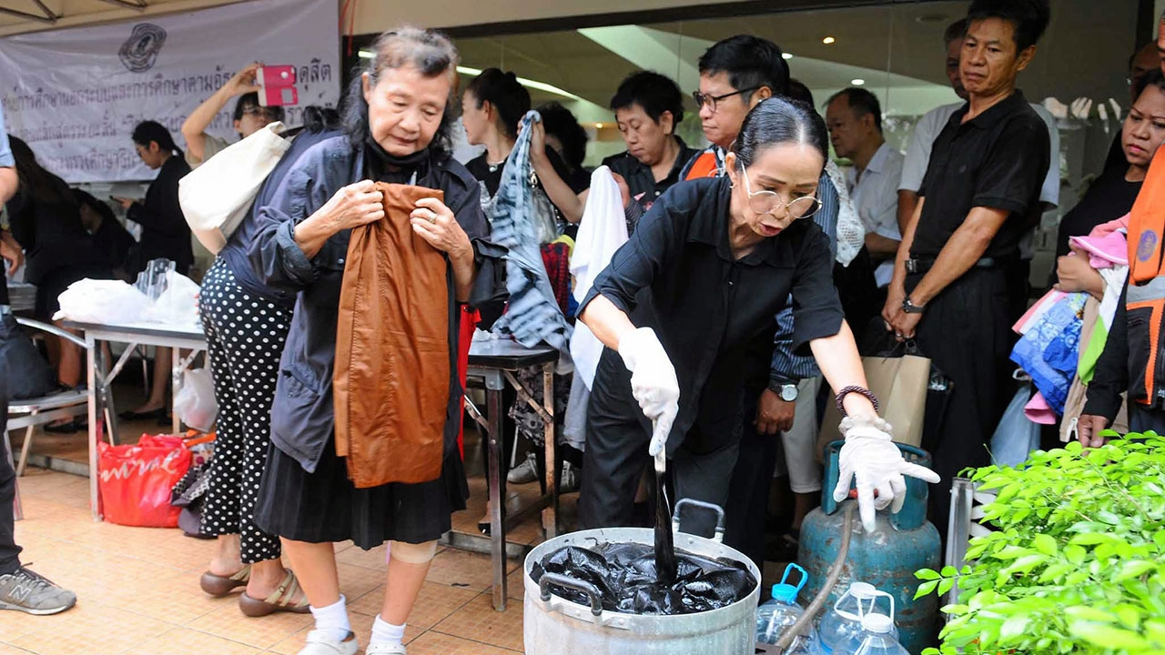 ขณะที่นายประพัทธพงศ์ พราหมณี นอภ.บัวใหญ่ จ.นครราชสีมา เปิดเผยว่า อำเภอบัวใหญ่ได้จัดทำโครงการย้อมเสื้อผ้าสีดำฟรีและรับบริจาคเสื้อผ้า เนื่องจากช่วงนี้เสื้อผ้าสีดำมีราคาแพงและขาดตลาดเพื่อไม่ให้ประชาชนต้องเดือดร้อนโดยให้ทุกองค์กรปกครองส่วนท้องถิ่น (อปท.) ในพื้นที่ดำเนินการหรือที่ กศน.บัวใหญ่ และ จ.สุโขทัย นางเพทาย ซื่อสัจจพงษ์ ผอ.วิทยาลัยอาชีวศึกษาสุโขทัย เปิดเผยว่า วิทยาลัยอาชีวศึกษาสุโขทัยได้จัดฝึกสอนการย้อมผ้าสีดำให้แก่ประชาชนฟรีโดยไม่คิดค่าใช้จ่ายพร้อมทั้งสอนการทำริบบิ้นผ้าสีดำติดบริเวณอกเสื้อเพื่อถวายความอาลัยต่อพระองค์ท่าน โดยเริ่มเปิดทำการสอนตั้งแต่วันที่ 17 ต.ค.นี้เป็นต้นไป บริเวณเต็นท์ กิจกรรมหน้าวิทยาลัยอาชีวศึกษาสุโขทัย ส่วน จ.นครศรีธรรมราช ประชาชนแห่นำเสื้อผ้าไปย้อมเป็น สีดำเพื่อสวมใส่ไว้ทุกข์ หลังเสื้อสีดำเริ่มขาดตลาดและมีราคาสูงส่งผลให้ร้านรับย้อมผ้าในตลาดท่าเรียน ริมทางรถไฟ ถนนกะโรม อ.เมืองนครศรีธรรมราช มีประชาชนนำเสื้อผ้าย้อมสีตลอดทั้งวันสร้างรายได้จากวันละ 1,000-1,500 บาทเป็นวันละ 3,000 บาท