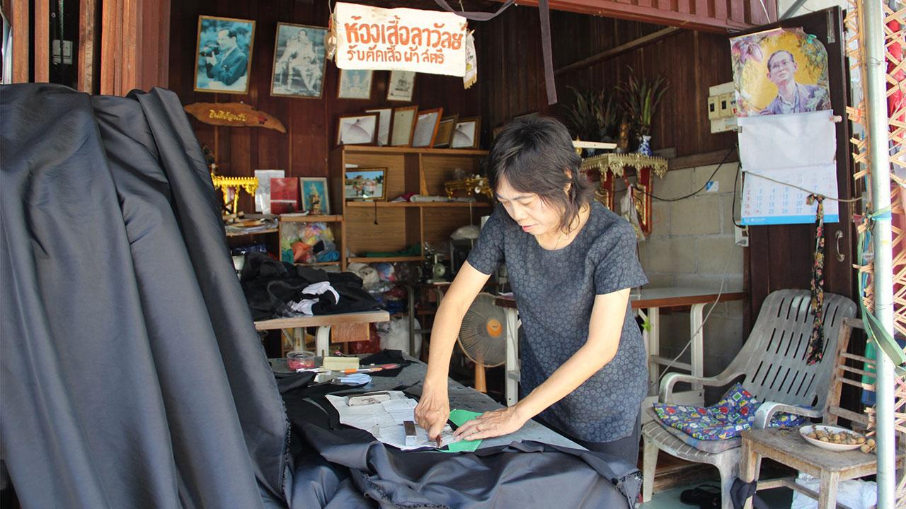 ขณะนี้ทางร้านก็ขาดแคลนผ้าดำที่จะนำมาตัดเย็บตามออร์เดอร์ลูกค้าที่มาสั่งต้องรอคิวกันยาวเหยียด เนื่องจากผ้าสีดำที่สั่งซื้อจากเอเย่นต์ ต้องรออีกประมาณ 1 อาทิตย์ จึงจะมีผ้าดำมาตัดจำหน่ายให้ประชาชนได้เลือกซื้อเลือกตัดเพื่อสวมใส่ร่วมแสดงความอาลัย ปัจจุบันทางร้านมีผ้าไตตัดเย็บสำเร็จรูปวางขายเหลือไม่ถึง 10 ชุด เนื่องจากประชาชนเดินทางมาซื้อกันเรื่อยๆ จนตัดไม่ทันขาย บางรายก็สั่งตัดคนละ 1-2 ชุด เพื่อใส่สับเปลี่ยนกันตลอดการไว้อาลัยภายใน 1 ปีนี้