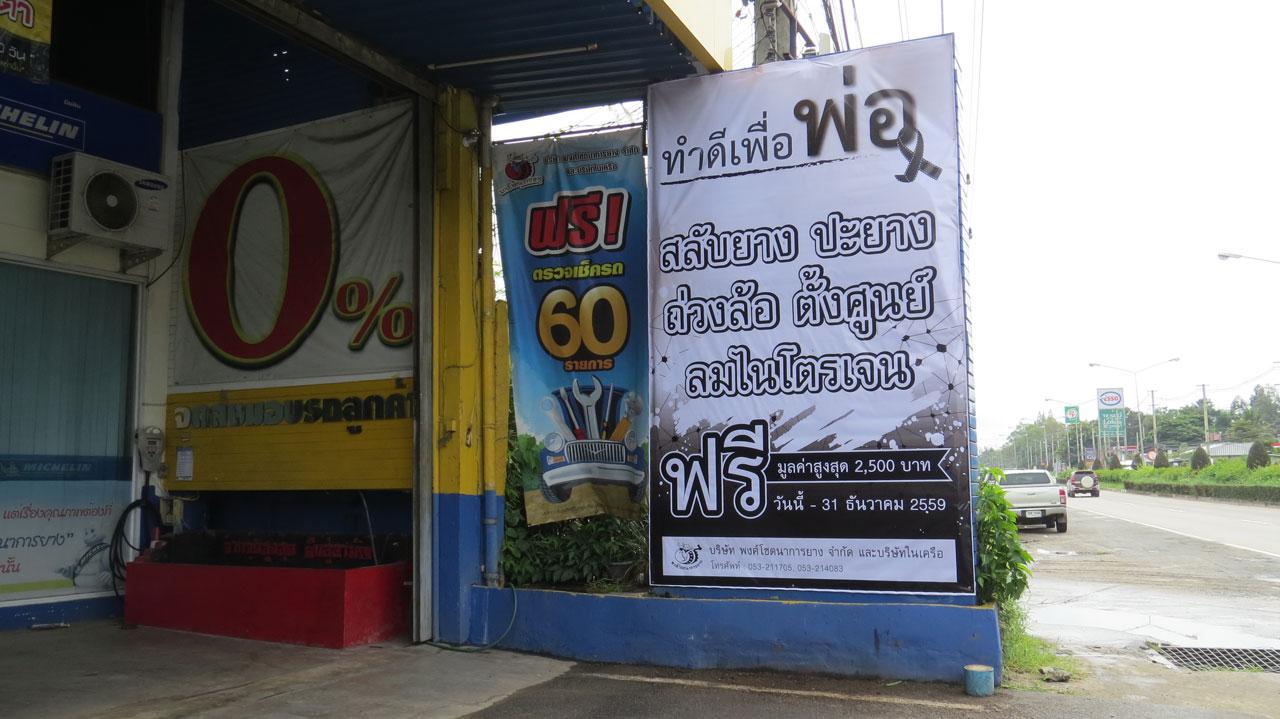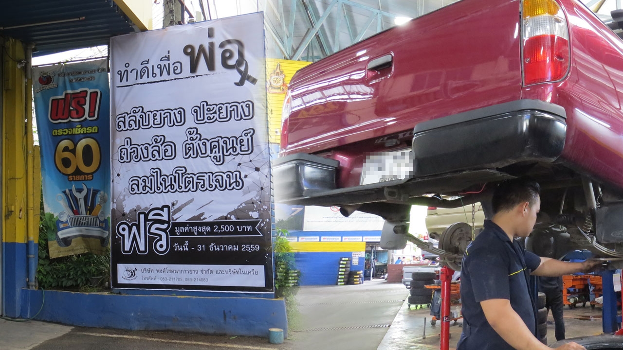 วันที่ 26 ต.ค. 59 ผู้สื่อข่าวรายงานว่า บริษัท พงษ์โชตนาการยาง จำกัด ทั้ง 3 สาขาในจังหวัดเชียงใหม่ คือ สาขาหน้าศาลากลางจังหวัดเชียงใหม่ สาขาก่อนถึงห้างแม็คโคร และสาขาก่อนถึงมหาวิทยาลัยแม่โจ้ ได้บริการลูกค้า ทำดีเพื่อพ่อ โดยบริการสลับยางรถยนต์ ปะยาง ตั้งศูนย์ถ่วงล้อ และเติมลมไนโตรเจนฟรี มูลค่า 2,500 บาท ให้กับลูกค้าและประชาชนผู้ใช้รถทั่วไป พร้อมกับขึ้นป้ายไวนิลขนาดใหญ่เอาไว้ที่หน้าบริษัททั้ง 3 สาขา ไปจนถึงวันที่ 31 ธ.ค. 2559