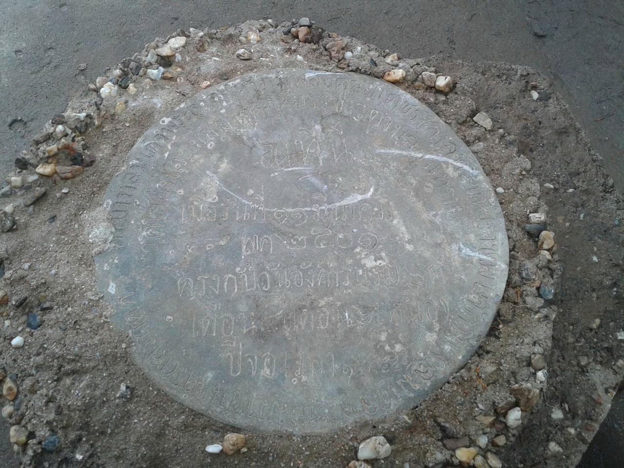 และเมื่อขุดลึกลงไป 1 เมตร พบแท่นจารึกขีดเป็นวงกลมบนแผ่นปูนมีฐานสี่เหลี่ยมเป็นระดับ 3 ชั้น ด้านบนภายในวงกลม มีข้อความเขียนจารึกด้วยคำว่า พระบาทสมเด็จพระเจ้าอยู่หัวภูมิพลอดุลยเดช รัชกาลที่ 9 แห่งราชวงศ์จักรี และสมเด็จพระบรมราชินีนาถสิริกิติ์” อยู่วงกลมแรกและบรรทัดที่ 2 เขียนว่า "ได้เสด็จแวะเยี่ยมพสกนิกรชาวตำบลสันทราย ณ ที่นี่ เมื่อวันที่ ๑๑ มีนาคม พ.ศ.๒๕๐๑ ตรงกับวันอังคารแรม 6 ค่ำ เดือน ๔ (เดือน ๖ เหนือ) ปีจอ เวลา ๑๖.๔๕ น." จึงช่วยกันนำไปไว้ภายในวัดสันทราย