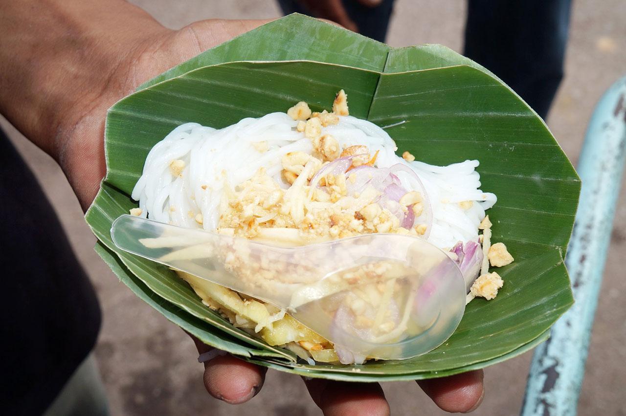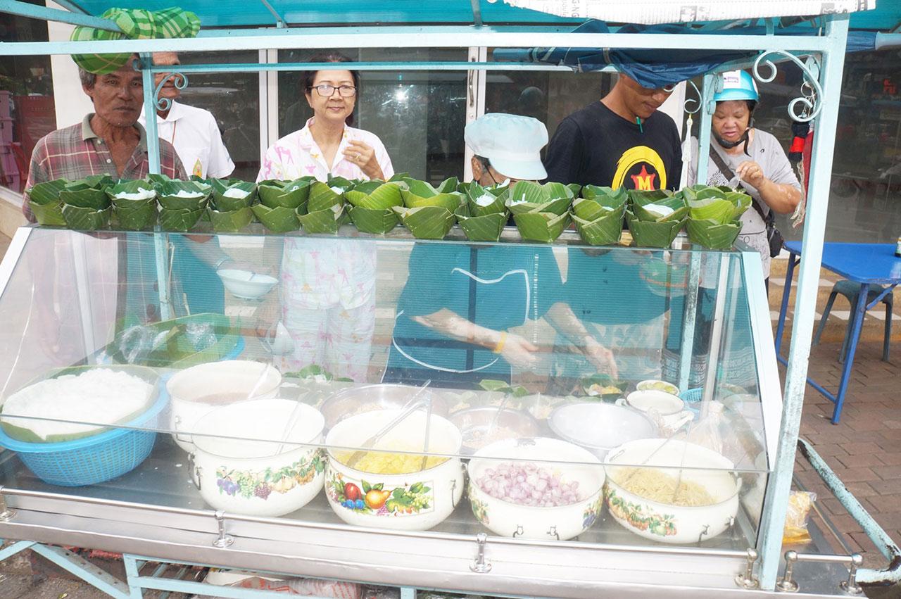 พบว่าบริเวณที่ยายแป๋วตั้งโต๊ะและรถเข็นเอาไว้ มีลูกค้ามายืนรับแจกขนมจีนซาวน้ำกันเป็นจำนวนมาก โดยยายแป๋วบอกว่า วันนี้ตั้งใจทำขนมจีนซาวน้ำมาแจกให้กินฟรี เพราะแทบจะไม่มีคนทำขายแล้ว เนื่องจากมีเครื่องเคียงหลายอย่าง ทั้งกุ้งแห้ง สับปะรด ขิง หอมแดง พริกขี้หนูซอย กะทิ มะนาว ถั่วลิสงคั่ว เป็นต้น ซึ่งปรากฏว่า ขนมจีนซาวน้ำจำนวน 399 กระทง ที่เตรียมมาแจก หมดภายในเวลาไม่ถึง 1 ชั่วโมง
