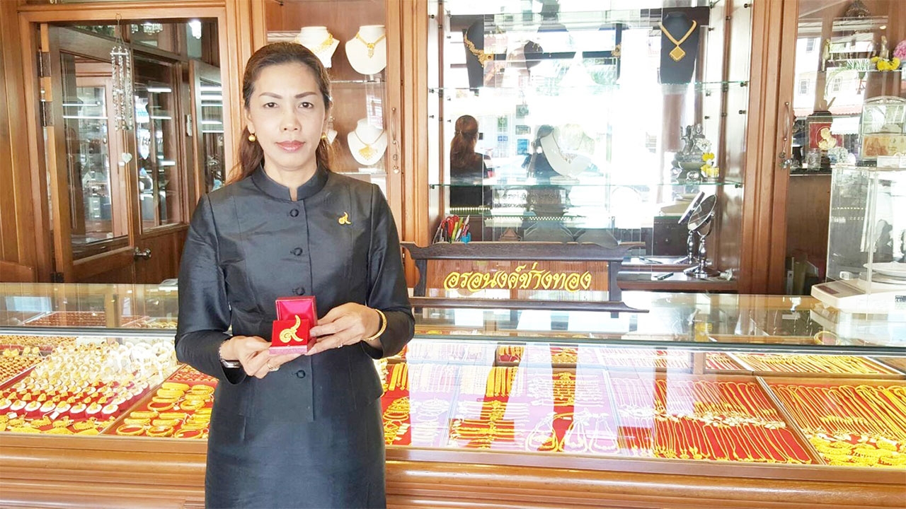 สาวใหญ่เจ้าของร้านทองโบราณ จ.สุโขทัย ออกแบบ “เข็มกลัด ๙ ไอยรา” จากทองคำแท้ 99.99% ลักษณะคล้าย "พระเศวตอดุลยเดชพาหนฯ" ชูงวง ประดับติดตัวเสมือนมีพระองค์อยู่ด้วยตลอด