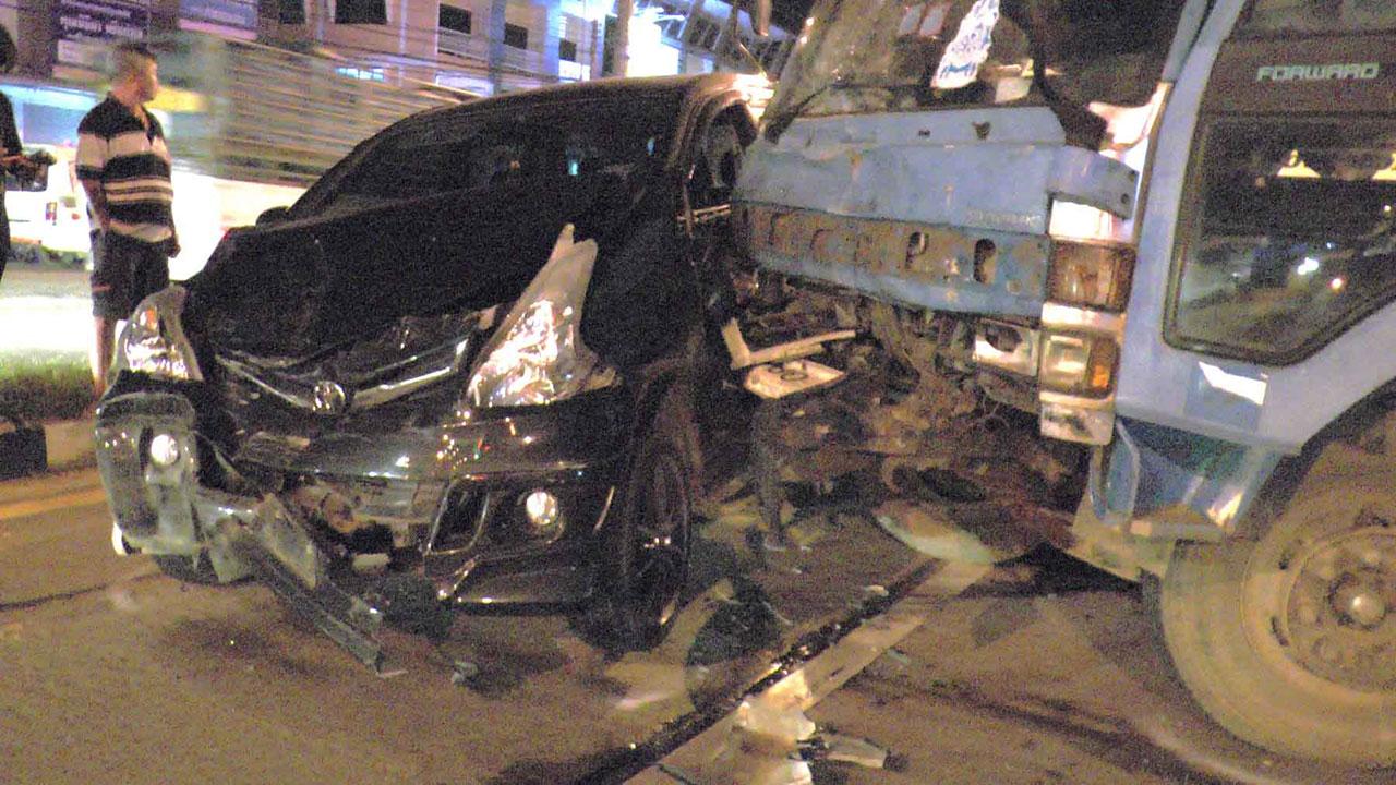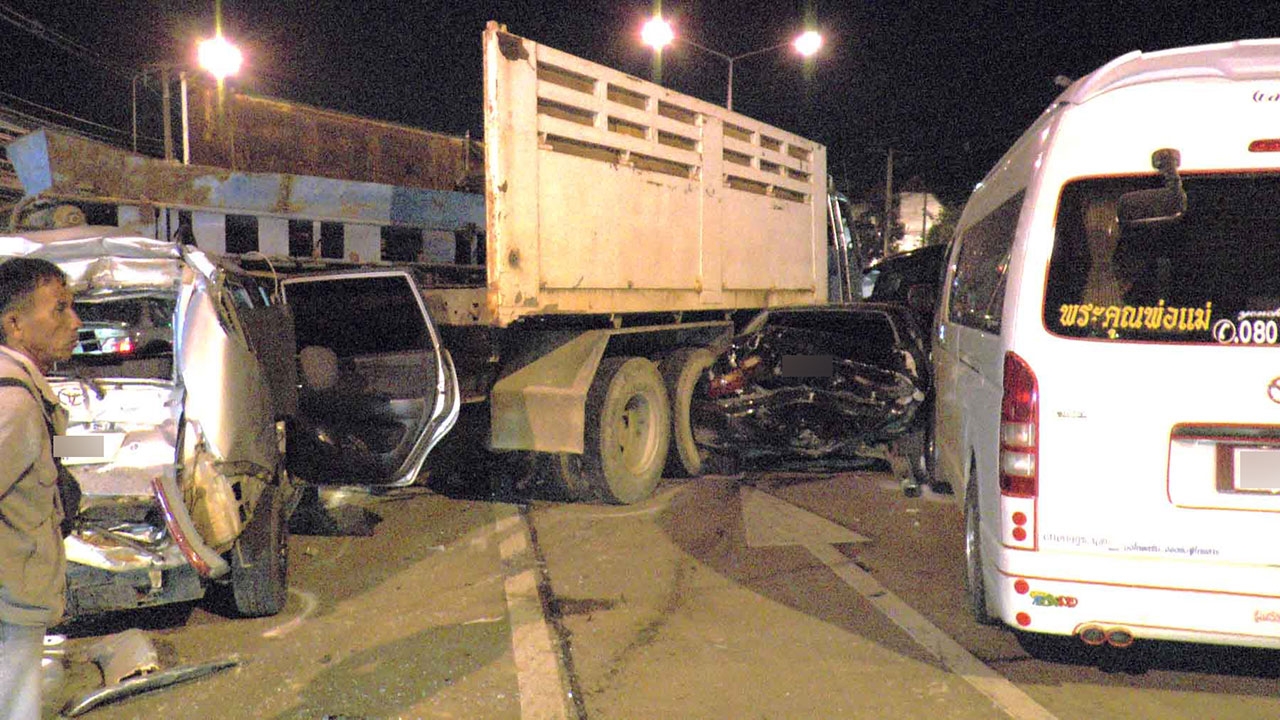 ที่เกิดเหตุเป็นสี่แยกไฟแดง บนถนนขาล่องห่างจากไฟแดงประมาณ 10 เมตร พบรถสิบล้อโตโยต้าสีฟ้าขาว ทะเบียน 80-1059 อุตรดิตถ์ ชนกับรถเก๋งและรถตู้ รวม 4 คัน คันแรกเป็นรถยนต์โยโตต้า อัลติส สีบรอนเงิน ทะเบียน 8088 แพร่ มีนางรัตนกาล สิงอุต อายุ 30 ปีเป็นคนขับ ได้รับบาดเจ็บติดในรถพร้อมด้วยนายปูลี่ สิงห์อุต อายุ 16 ปี ลูกชาย เจ้าหน้าที่ได้ช่วยกันนำออกมาจากรถส่งโรงพยาบาลเนื่องจากมีบาดเจ็บอาการสาหัส