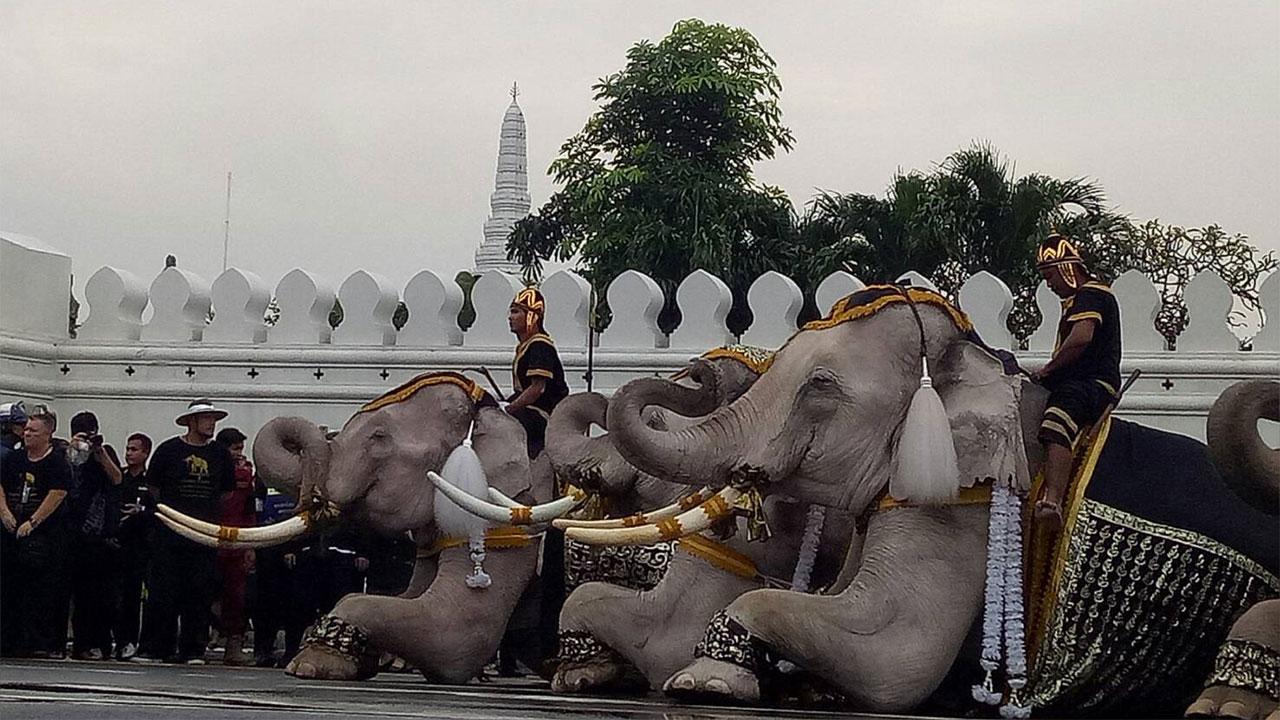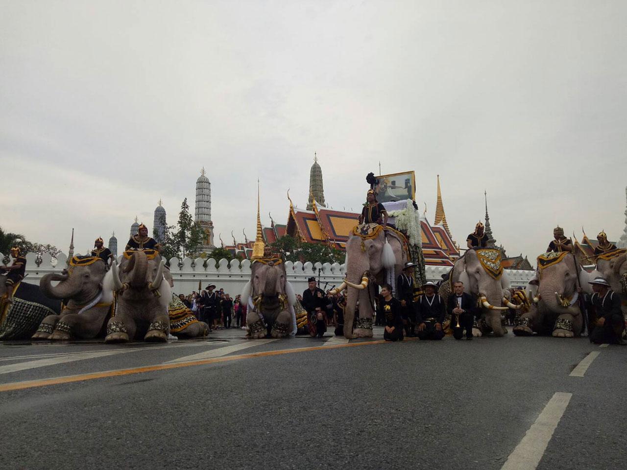 ทั้งนี้ คชสารทั้ง 11 เชือก ได้หมอบกราบ ถวายบังคมพระบรมศพ ก่อนควาญช้างร่วมร้องเพลงสรรเสริญพระบารมี ในหลวง รัชกาลที่ 9 ที่ด้านหน้าพระบรมมหาราชวัง ด้วยสำนึกในพระมหากรุณาธิคุณที่พระองค์ทรงมีต่อช้างไทย