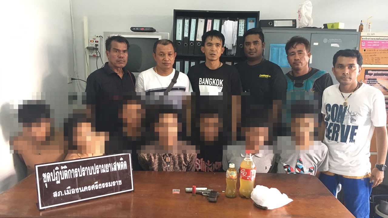 เยาวชนแก๊งป่าพร้าว วิ่งหนีกระเจิง หลัง ตร.เมืองคอน บุกค้นบ้านแหล่งมั่วเสพยา 1 ในผู้ต้องหาปีนขึ้นหลังคาใช้ปืนไทยประดิษฐ์พยายามยิงต่อสู้ สุดซวยกระเบื้องแตกพลาดตก ตร.รวบตัวได้ทั้ง 8 ราย ตรวจปัสสาวะเป็นสีม่วง ยึด น้ำกระท่อม-ยาบ้า