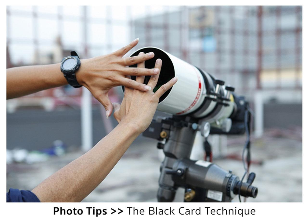 5. แบล็กการ์ดเทคนิค - การใช้มือบังบริเวณหน้าเลนส์บริเวณขอบภาพ ตำแหน่งของดวงจันทร์เพื่อให้แสงสว่างของดวงจันทร์ลดลง แล้วจึงกดชัตเตอร์ จะช่วยให้ได้ภาพถ่ายที่มีความสว่างต่างกันไม่มากนัก สามารถนำไปปรับแต่งในโปรแกรม Photoshop โดยการดึง Shadow บริเวณฉากหน้า และลดแสง Highlight ลงได้ง่ายขึ้น โดยไม่จำเป็นต้องใช้อุปกรณ์อื่นๆ เช่น ฟิลเตอร์ครึ่งซีกมาช่วย