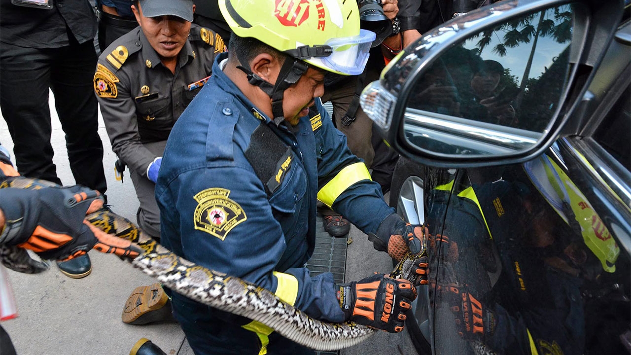 เจ้าหน้าที่กู้ภัยช่วยกันนำ งูเหลือมตัวยาวกว่า 2 เมตร ที่จู่ๆเลื้อยหลงเข้าไปติดอยู่ใต้ห้องเครื่องรถโตโยต้าคัมรี สีดำ ทะเบียน 2 กผ 946 กรุงเทพมหานคร ที่จอด อยู่บริเวณลานจอดรถข้างตึกบัญชาการ ทำเนียบรัฐบาล โดยช่างต้องรื้อชิ้นส่วนรถบางส่วนกว่าจะดึงตัวออกมา ได้อย่างปลอดภัย.