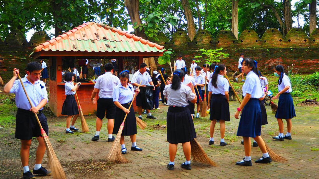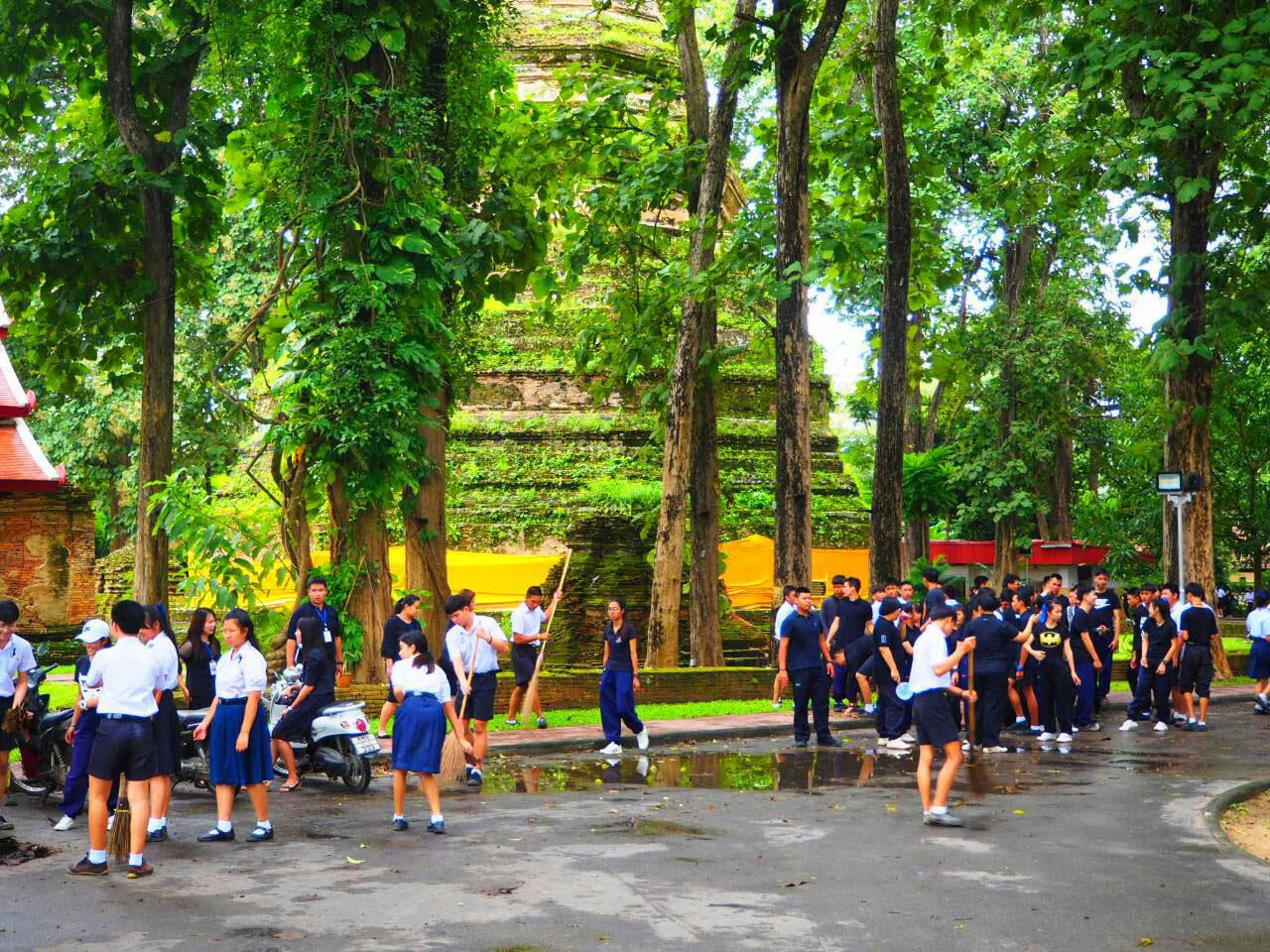 ทั้งนี้ ได้ร่วมกันขับร้องเพลงสรรเสริญพระบารมีอย่างพร้อมเพรียงกัน เพื่อแสดงความจงรักภักดีและสำนึกในพระมหากรุณาธิคุณของพระบาทสมเด็จพระปรมินทรมหาภูมิพลอดุลยเดช ในระหว่างนั้นมีนักท่องเที่ยวชาวต่างชาติมายืนดู และร่วมร้องเพลงสรรเสริญพระบารมีด้วย พร้อมทั้งได้ร่วมกันยืนสงบนิ่งเป็นเวลา 9 นาที จากนั้นครูและนักเรียนได้แยกกันไปทำกิจกรรม กวาดใบไม้และเก็บขยะ ตามสถานที่สำคัญๆ อาทิ วัดพระธาตุเจดีย์หลวง ศาลเจ้าพ่อประตูป่าสัก และบนถนนพหลโยธิน ตั้งแต่บริเวณหน้าศาลเจ้าพ่อประตูป่าสัก ไปตามถนนพหลโยธิน เป็นระยะทาง 1 กม. เป็นการทำความดีถวายพ่อหลวง