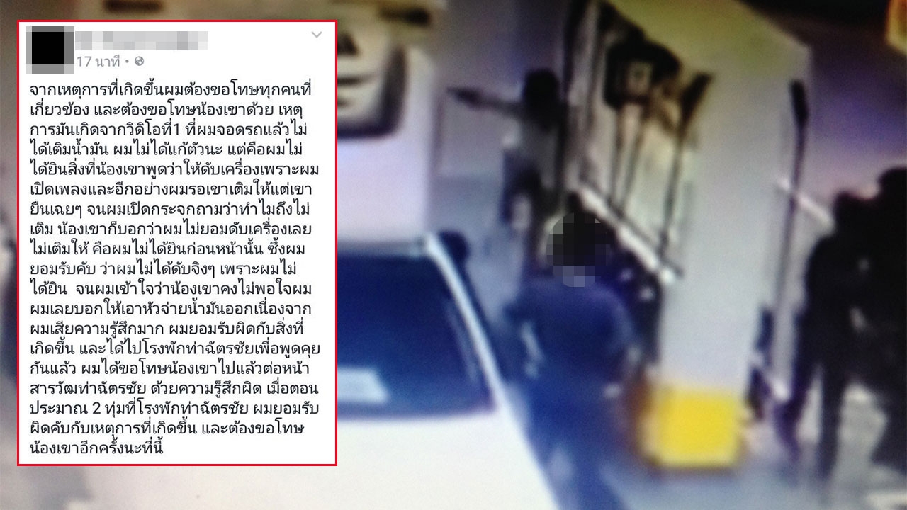 ล่าสุด เมื่อช่วงเช้าวันที่ 11 พ.ย. ผู้ที่ใช้เฟซบุ๊ก ชื่อ Siri Kwanmongkol ได้โพสต์ข้อความเกี่ยวกับเหตุการณ์ที่เกิดขึ้นผ่านโซเชียลว่า ”จากเหตุการณ์ที่เกิดขึ้น ผมต้องขอโทษทุกคนที่เกี่ยวข้องและต้องขอโทษน้องเขาด้วย เหตุการณ์เกิดจากวิดีโอที่ 1 ที่ผมจอดรถแล้วไม่ได้เติมน้ำมัน ผมไม่ได้แก้ตัวนะ แต่คือผมไม่ได้ยินที่น้องเขาพูดว่าให้ดับเครื่อง เพราะผมเปิดเพลง และอีกอย่าง ผมรอเขาเติมให้ แต่เขายืนเฉยๆ จนผมเปิดกระจกถามว่าทำไมถึงไม่เติม น้องเขาก็บอกว่า ผมไม่ยอมดับเครื่องเลยไม่เติมให้ คือผมไม่ได้ยินก่อนหน้านั้น ซึ่งผมยอมรับครับว่า ผมไม่ได้ดับจริงๆ เพราะผมไม่ได้ยิน จนผมเข้าใจว่าน้องเขาไม่พอใจผม ผมเลยบอกให้เอาหัวจ่ายออก เนื่องจากผมเสียความรู้สึกมาก ผมยอมรับผิดกับสิ่งที่เกิดขึ้น และได้ไปที่โรงพักท่าฉัตรไชย เพื่อพูดคุยกันแล้ว ผมได้ขอโทษน้องเขาไปแล้วต่อหน้าสารวัตรท่าฉัตรไชย ด้วยความรู้สึกผิด เมื่อตอนประมาณ 2 ทุ่ม ที่โรงพักท่าฉัตรไชย ผมยอมรับผิดครับ กับเหตุการณ์ที่เกิดขึ้น และต้องขอโทษน้องเขาอีกครั้ง ณ ที่นี้” จากนั้นได้มีผู้คนแชร์โพสต์ดังกล่าวกันอย่างแพร่หลายในโลกโซเชียล พร้อมกับแสดงความคิดเห็นกันอย่างหลากหลาย ซึ่งส่วนใหญ่ยังคงไม่พอใจกับผู้ก่อเหตุ เพียงแค่กล่าวคำว่าขอโทษ ต้องให้เจ้าหน้าที่ตำรวจดำเนินคดีตามกฎหมาย เพื่อไม่ให้ใครเอาเป็นตัวอย่าง