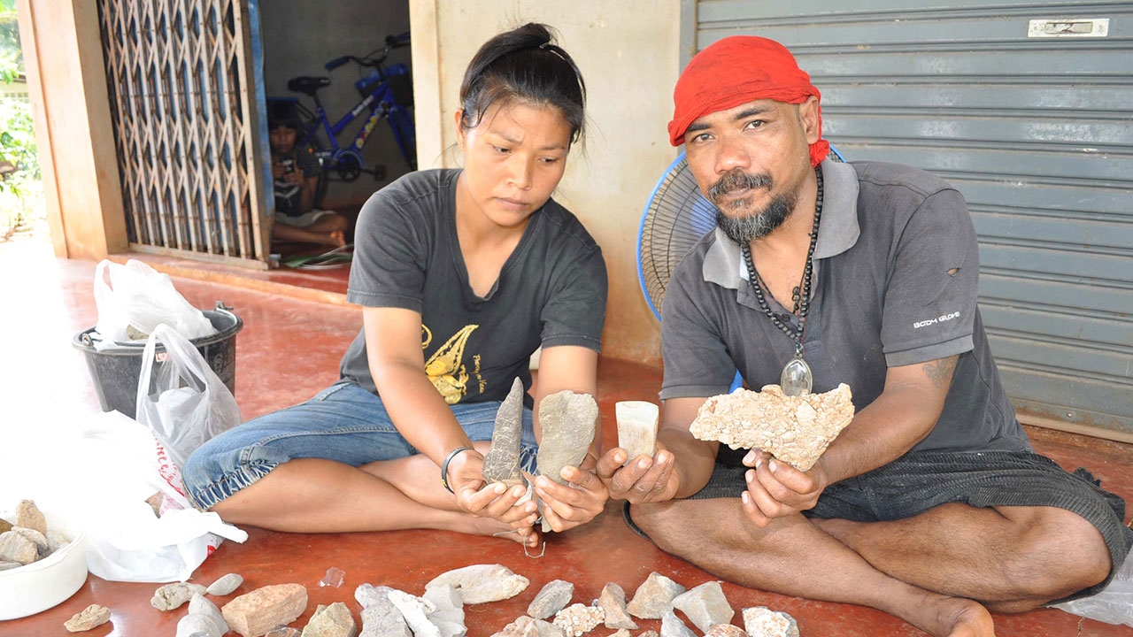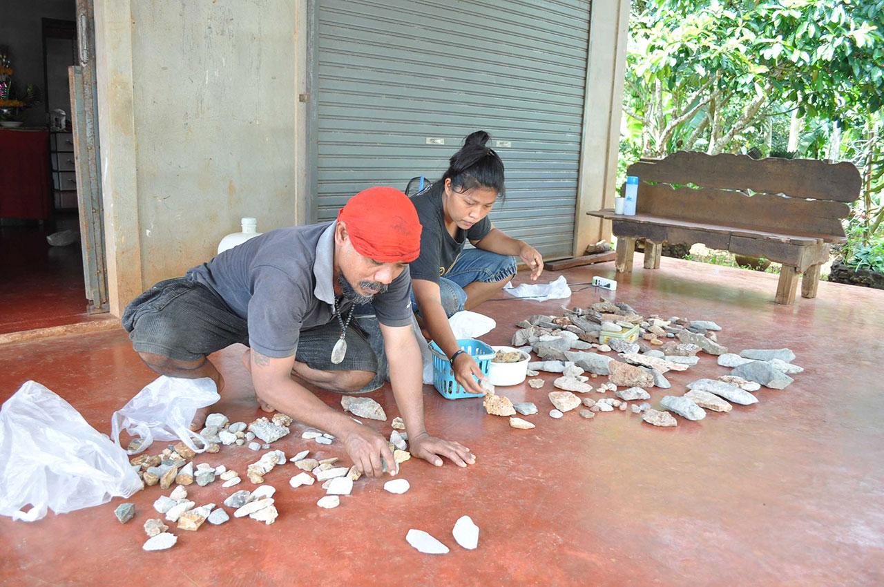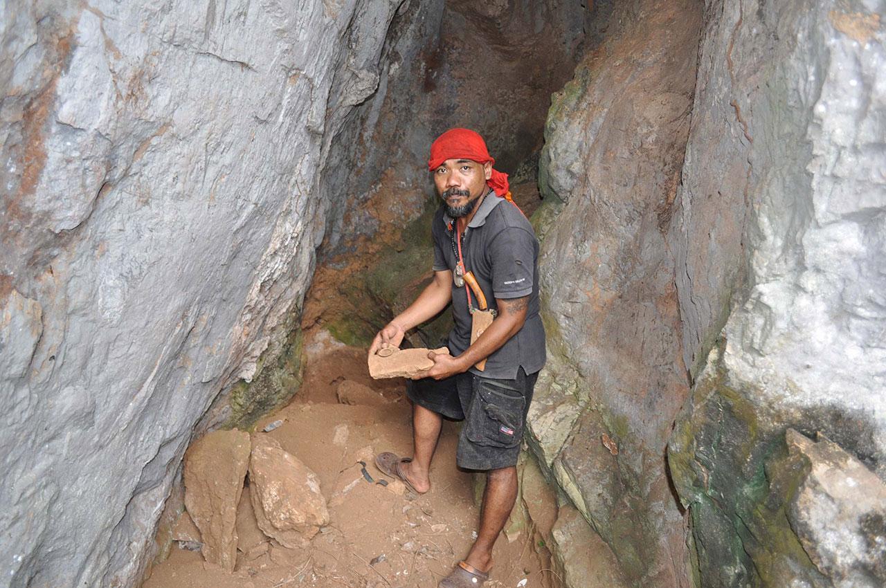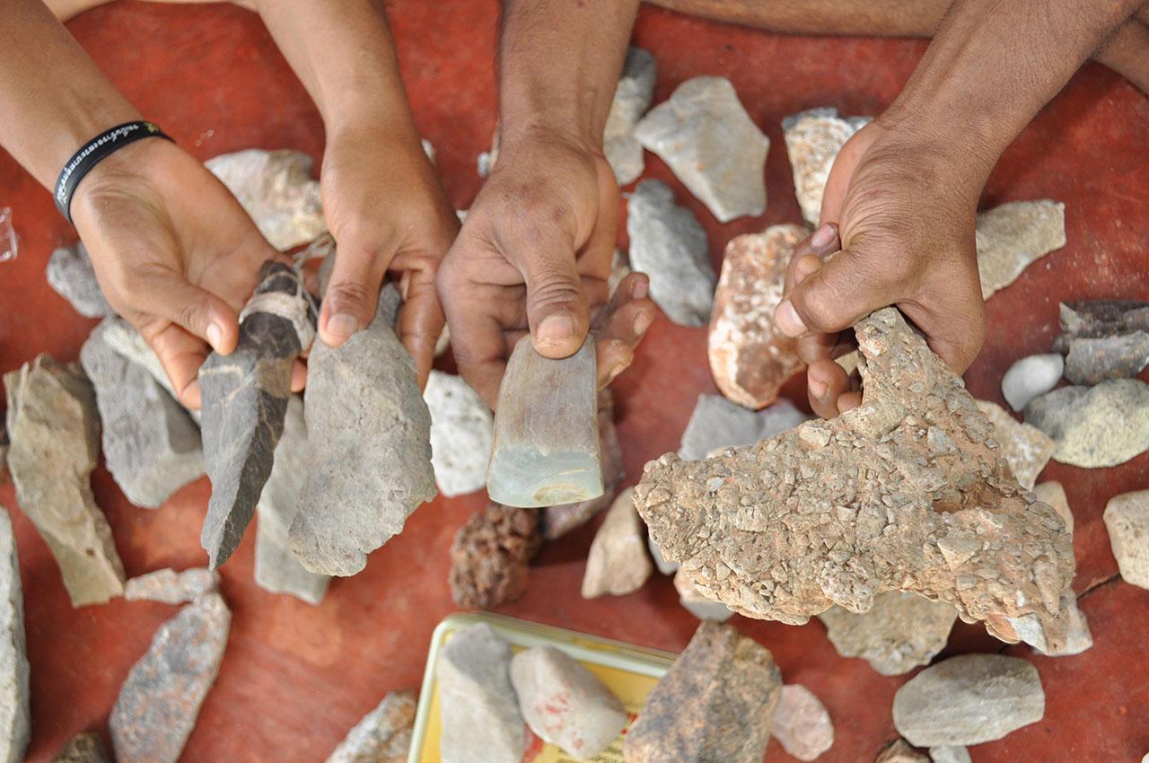 นายเดชชัย พร้อมครอบครัว นำหินรูปร่างต่างๆ เหมือนขวาน กริชหิน กระดูกช้าง ซึ่งขุดมาได้จากบริเวณหน้าถ้ำภูเขาน้ำฉา ซึ่งภูเขาดังกล่าวเป็นภูเขาหินปูน มีหน้าผาสูงชัน อยู่รายรอบหมู่บ้าน และยังมีถ้ำอยู่หลายแห่งรอบภูเขา โดยจุดที่พบหินรูปร่างต่างๆ อยู่ห่างจากบ้านเพียงแค่ 150 เมตร