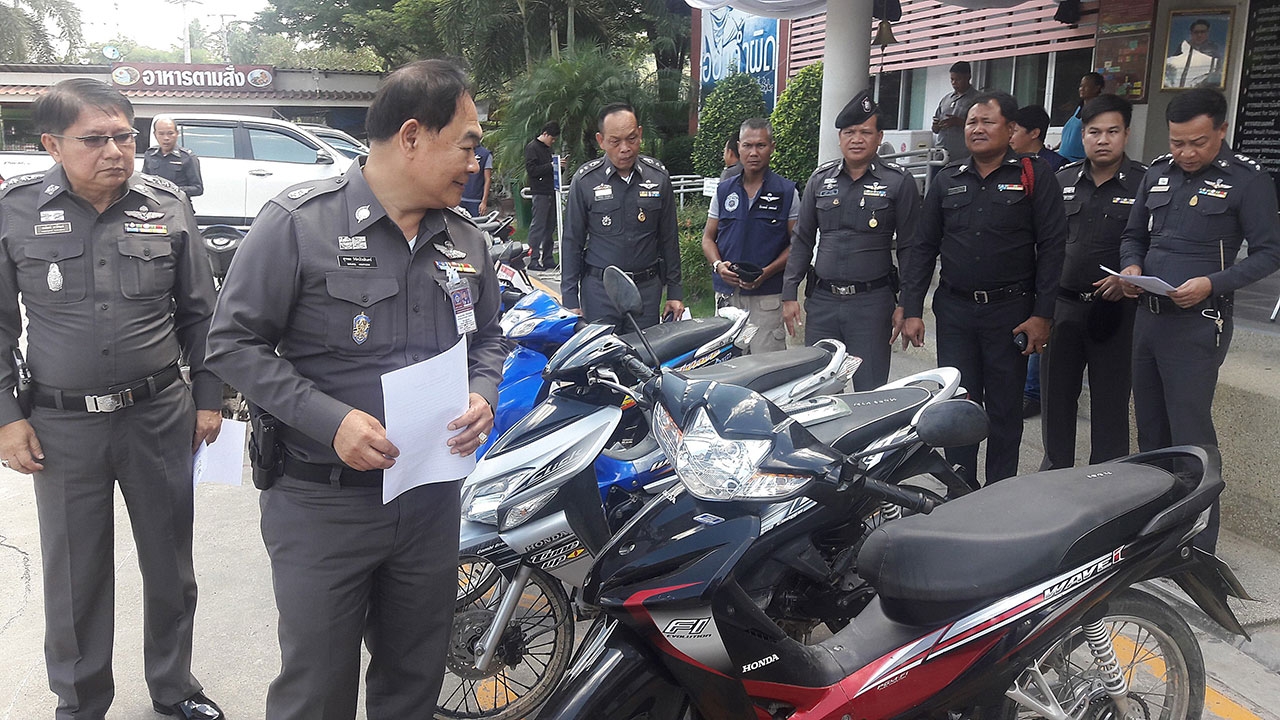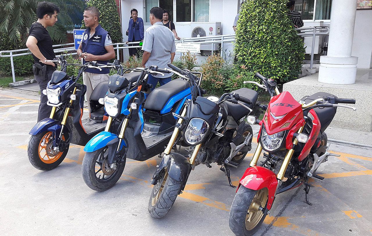 ตร.หนองขาม จ.ชลบุรี ตามรวบแก๊งลักจักรยานยนต์ ผู้ต้องหาเป็นโจ๋วัย 18 ปี 2 คน กับหนุ่มเขมร พร้อมของกลางมอเตอร์ไซค์ 9 คัน จ่อส่งขายกัมพูชา พร้อมจับชาวศรีราชา ยึดปืน 5 กระบอก