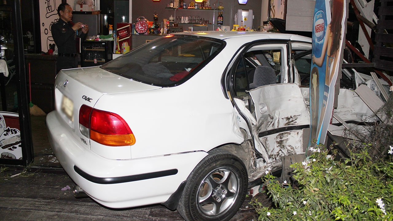 ทหารขับเก๋งตัดหน้าระยะประชิด หนุ่มประจวบฯ เบรกไม่ทันพุ่งเข้าชนอย่างแรง ก่อนเสียหลักไปชนกับร้านกาแฟริมถนนเพชรเกษม เมืองเพชรบุรี พบทรัพย์สินเสียหายเพียบ