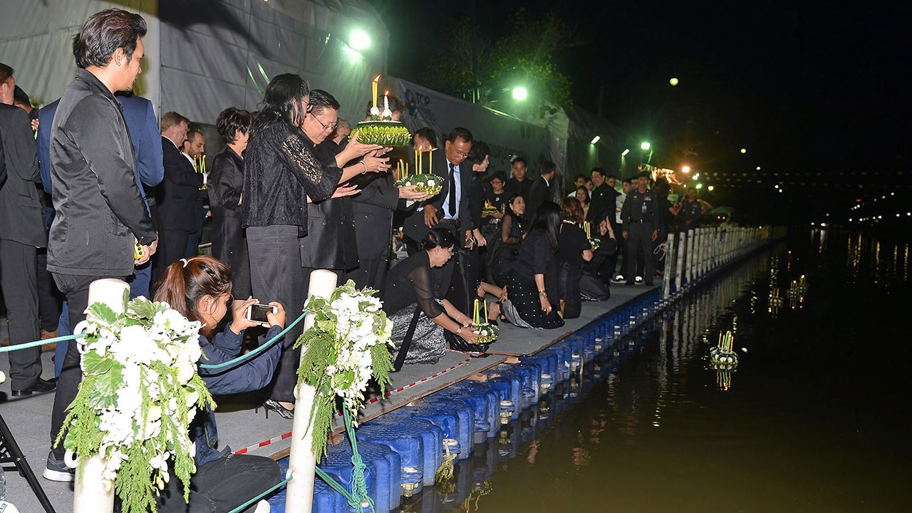 ที่ศูนย์การค้าเอเชียทีค เดอะริเวอร์ฟร้อนท์ ถนนเจริญกรุง กทม. บรรยากาศงานลอยกระทงมีชาวไทยและต่างชาติเดินทางมาลอยกระทงจำนวนมาก บริเวณทางเข้า-ออกมีการตั้งจุดคัดกรองบุคคล ตรวจบัตรประชาชนและตรวจหนังสือเดินทางของชาวต่างชาติอย่างเข้มงวด ส่วนภายในศูนย์การค้ามีตำรวจ ทหาร และเจ้าหน้าที่กรมเจ้าท่าคอยอำนวยความสะดวก นอกจากนี้ ศูนย์การค้าไม่อนุญาตให้ ลอยกระทงที่ท่าเรือโดยตรงเพราะอาจเกิดอันตราย แต่นำไม้ไผ่ยาวประมาณ 5 ม.มีตะกร้าใส่กระทง ให้ผู้ต้องการลอยกระทงยื่นไม้ส่งกระทงลงแม่น้ำเจ้าพระยาเพื่อความปลอดภัย ทั้งนี้ ประชาชนส่วนใหญ่ยังคงใส่เสื้อผ้าชุดขาวดำ บรรยากาศโดยรวมเป็นไปอย่างเงียบเหงา เรียบง่าย