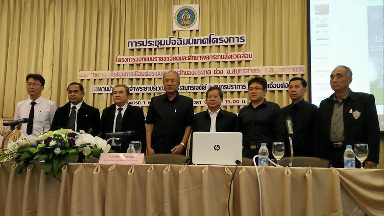 นายสุรชัย ศิริดาวทอง ผอ.แขวงทางหลวงชนบทสมุทรสาคร เป็นประธานเปิดการประชุมปัจฉิมนิเทศโครงการออกแบบรายละเอียดและศึกษาผลกระทบสิ่งแวดล้อม โครงข่ายทางสนับสนุนการเชื่อมต่อระบบขนส่งหลักของประเทศ ช่วงสมุทรสาครถึงสมุทรปราการ (สะพานข้ามแม่น้ำเจ้าพระยา บริเวณ อ.พระสมุทรเจดีย์ จ.สมุทรปราการและถนนเชื่อมต่อ) ที่ห้องประชุมโชติกา โรงแรมเซ็นทรัลเพลส ต.มหาชัย อ.เมืองสมุทรสาคร นายจิรานุวัฒน์ จันทร์จร ผู้แทนกรมทางหลวงชนบท กล่าวว่า เนื่องจากปัจจุบันปัญหาด้านการจราจรมีแนวโน้มเพิ่มมากขึ้น กระทรวงคมนาคมได้เล็งเห็นปัญหาและได้กำหนดแผนเร่งรัดการดำเนินการพัฒนาโครงข่ายการเดินทางเชื่อมต่อระหว่างสองฝั่งแม่น้ำเจ้าพระยาให้ดียิ่งขึ้น จึงมอบหมายให้สำนักนโยบายและแผนการขนส่งและจราจร หรือ สนข. ดำเนินการศึกษาและจัดทำแผนแม่บทสะพานข้ามแม่น้ำเจ้าพระยา โดยเสนอให้มีการก่อสร้างสะพานข้ามแม่น้ำเจ้าพระยาบริเวณ อ.พระสมุทรเจดีย์ เพื่อแก้ไขปัญหาการจราจรและรองรับปริมาณการจราจรที่เพิ่มขึ้น