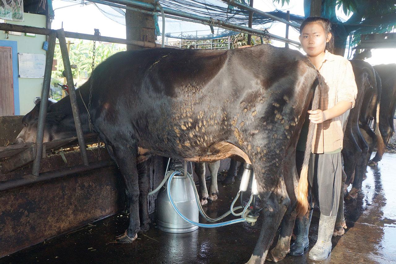 สาวเจ้าของฟาร์มวัวนมสุโขทัย โชว์ตัว “เจ้าหมวย” แม่วัวสีน้ำตาลเข้มอายุ 3 ปี กำลังตั้งท้อง พบมีรูปหัวใจสีขาวอยู่กลางหน้าผาก เชื่อ นำโชคลาภมาให้
