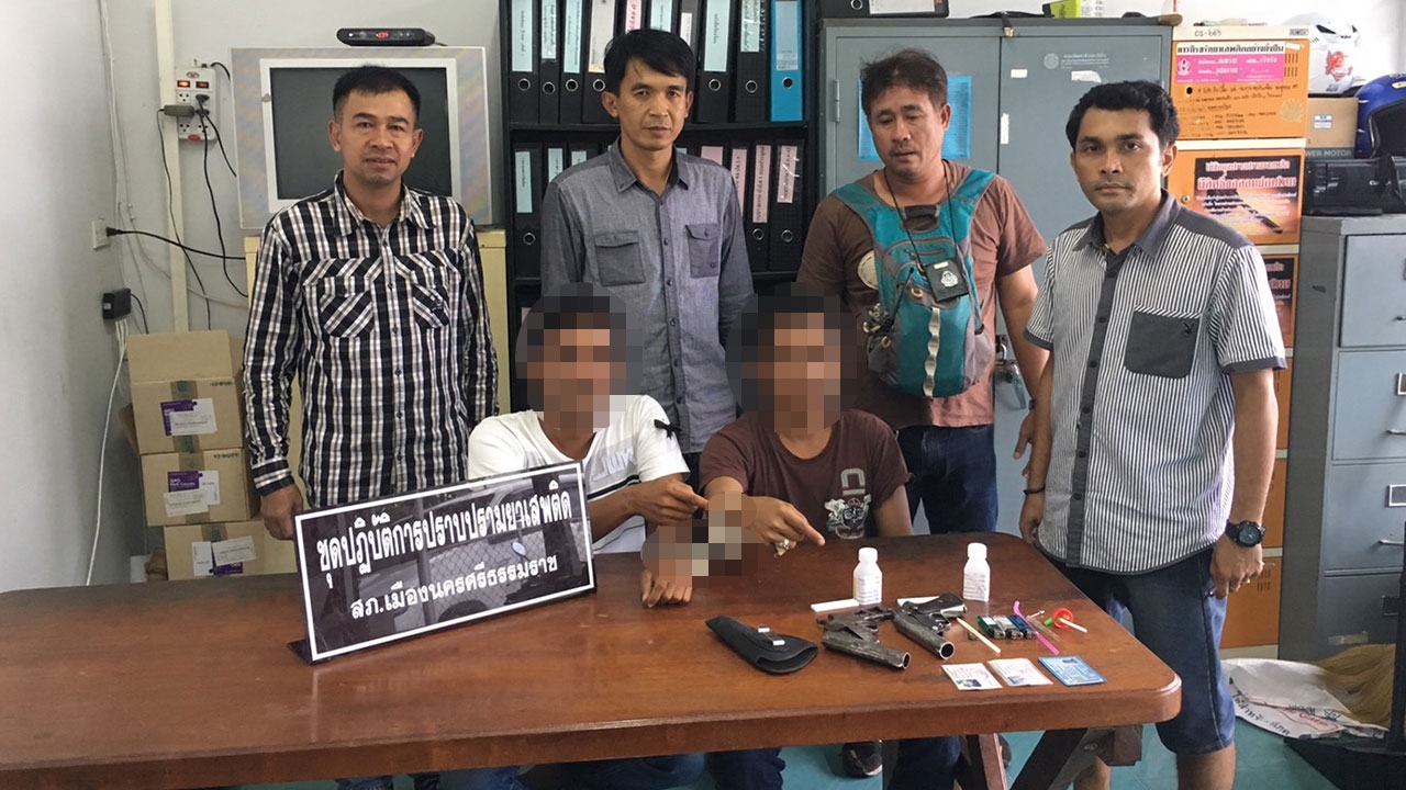 เมื่อวันที่ 17 พ.ย. 59 พ.ต.ท.สมพร เพ็ชรหนองชุม สว.สส.สภ.เมืองนครศรีธรรมราช ทำหน้าที่หัวหน้าชุดปราบปรามยาเสพติด สภ.เมืองนครศรีธรรมราช นำกำลังชุดปราบปรามยาเสพติด ตรวจค้นบ้านเลขที่ 73/1 หมู่ที่ 7 ต.โพธิ์เสด็จ อ.เมือง จ.นครศรีธรรมราช จับกุมนายวินัย ลักษณะกะชา อายุ 39 ปี อาสาสมัครป้องกันภัยฝ่ายพลเรือน (อปพร.)และชุดรักษาความปลอดภัยหมู่บ้าน(ชร.บ.) ของ ต.โพธิ์เสด็จ อ.เมือง และนายอภิรักษ์ กาญจนะ อายุ 32 ปี อาสาสมัครตำรวจบ้าน (อส.ตร) ของสภ.เมืองนครศรีธรรมราช ขณะมั่วสุมเสพยาบ้า พร้อมตรวจยึดอาวุธปืนลูกซอง กระสุนขนาดเบอร์ 12 จำนวน 2 กระบอก ซุกซ่อนอยู่ภายในบ้าน