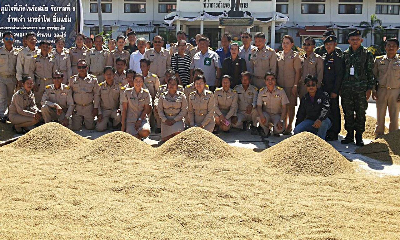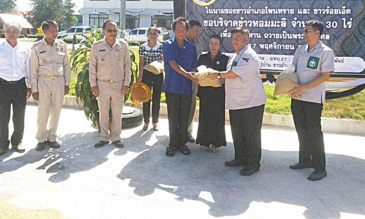 เวลา 11.30 น. วันที่ 17 พ.ย. 59 นายสฤษดิ์ วิฑูรย์ ผู้ว่าราชการจัวงหวัดร้อยเอ็ด พร้อมด้วย นายเธียรชัย พุทธรังสี ปลัดจังหวัดร้อยเอ็ด นายสราวุฒิ ธนาเจิญสกุล นายอำเภอโพนทราย ว่าที่ ร.ท.กล้าณรงค์ อารีเอื้อ ปลัดอาวุโส อ.โพนทราย ร่วมกันรับมอบข้าวหอมมะลิจาก นางลำไพ ยิ้มแย้ม อายุ 56 ปี ชาวบ้าน หมู่ที่ 6 ต.ศรีสว่าง อ.โพนทราย จ.ร้อยเอ็ด ซึ่งมีความประสงค์บริจาคข้าวหอมมะลิ ในนาพื้นที่ 30 ไร่ ใช้รถเก็บเกี่ยวแล้ว ได้ข้าวเปลือกหนักประมาณ 8 ตัน ที่กำลังตากให้แห้ง เพื่อจะให้โรงสีข้าวแปรูปเป็นข้าวสาร เพื่อให้นำไปมอบให้โรงทานที่ท้องสนามหลวง กทม. ทำเป็นอาหารแจกจ่ายให้ประชาชนที่ไปกราบถวายสักการะ พระบรมศพพระบาทสมเด็จพระปรมินทรมหาภูมิพลอดุลยเดช ได้รับประทาน และเพื่อน้อมเกล้าฯ ถวายเป็นพระราชกุศลแด่พระบาทสมเด็จพระปรมินทรมหาภูมิพลอดุลยเดช