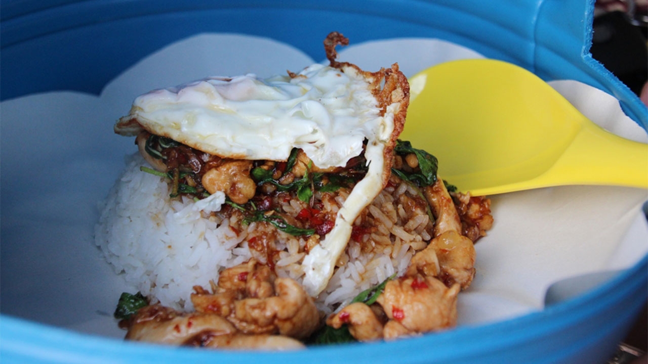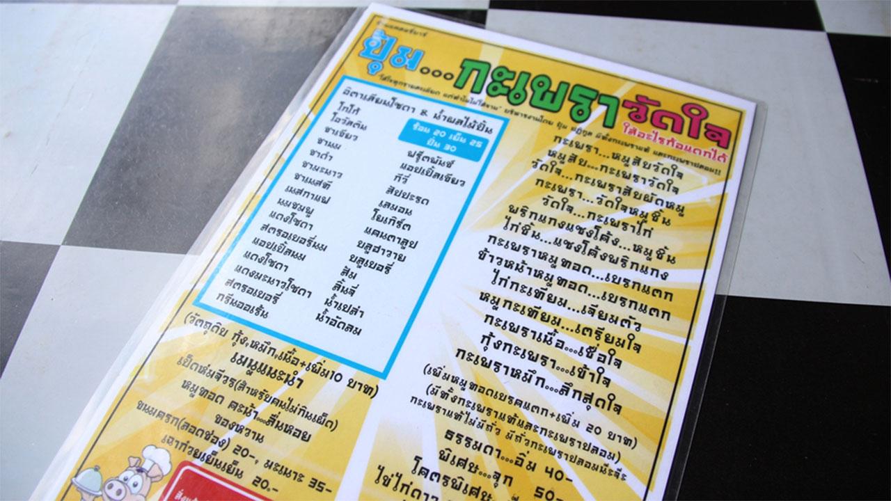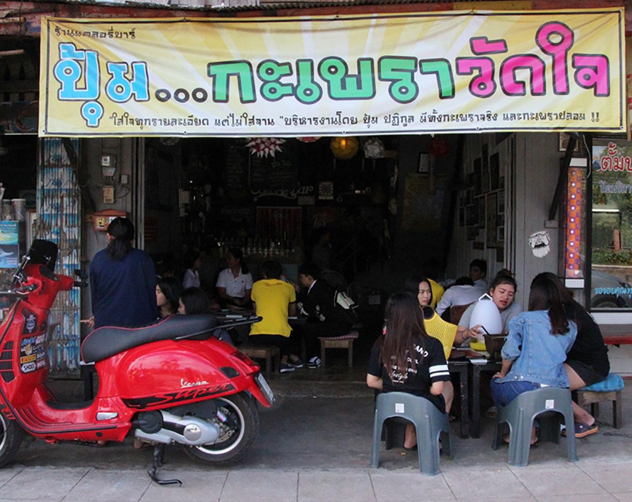 วันที่ 18 พ.ย. 59 ผู้สื่อข่าวเข้าพิสูจน์ร้านขายอาหารตามสั่งแห่งหนึ่ง ที่มีไอเดียแปลกเป็นที่สะดุดตา สร้างจุดขายอย่างโดดเด่น ชนิดผู้ที่ผ่านไป-มาบนถนนสายรักศักดิ์ชมูล ฝั่งขาออกตัวเมือง ตรงข้ามกับวัดเขาแก้ว ต.ท่าช้าง อ.เมืองจันทบุรี ต้องชำเลืองมองด้วยสายตาที่สงสัย ชื่อร้าน “ปุ้มกะเพราวัดใจ” เลขที่ 84/5 ต.ท่าช้าง ที่มี นายอนุพันธุ์ ฆ้องย่ำ อายุ 35 ปี เจ้าของร้านอาหารตามสั่ง และยังเป็นคนที่ทำอาหารมาเสิร์ฟให้กับลูกค้าด้วยตัวเอง ซึ่งในแต่ละวันที่ร้านจะมีลูกค้าเข้ามาสั่งอาหารรับประทานเป็นจำนวนมาก หลังจากทางร้านผุดไอเดียการขายและเสิร์ฟอาหารที่ไม่เหมือนใคร ชนิดลูกค้าสายแข็งที่มานั่งรับประทานต้องมีลุ้นและอึ้งกับภาชนะที่ใส่อาหารแล้วนำมาเสิร์ฟ เช่น ถ้าสั่งผัดกะเพรา ภาชนะก็จะเป็น เก้าอี้, โอ่งพลาสติก, รถบรรทุกของเล่น, พลั่วตักดิน, บัวรดน้ำ, บุ้งกี๋ หรือกระทั่งที่โกยขยะ ตะกร้าผ้า เครื่องชั่งน้ำหนัก และอื่นๆ อีกสารพัดภาชนะ โดยจะไม่มีการใส่จานหรือชามแบบปกติทั่วไป แต่จะนำกระดาษสำหรับใส่อาหารมารองพื้นกับภาชนะแล้วใส่อาหาร ขณะเดียวกัน หลอดดูดน้ำที่มีไว้ให้บริการลูกค้าจะมีชนิดแบบสั้นมาก และแบบยาวมากสุดจะบรรยาย ตามความต้องการสำหรับผู้ที่ชื่นชอบอีกด้วย โดยอาหารราคาเริ่มต้นที่ 40 บาท ส่วนน้ำราคาเริ่มต้นที่ 20 บาท