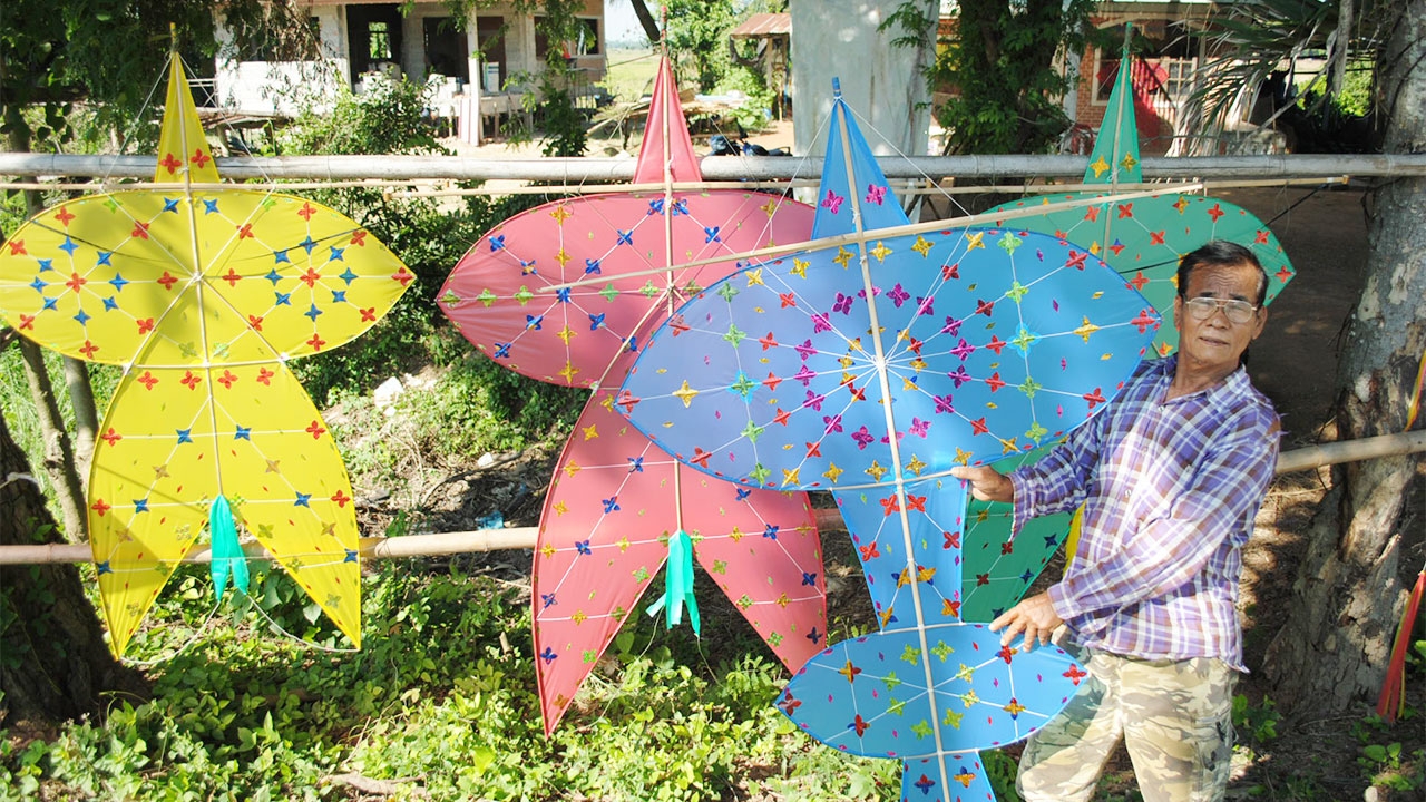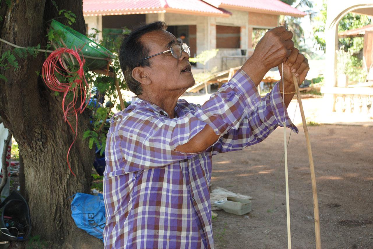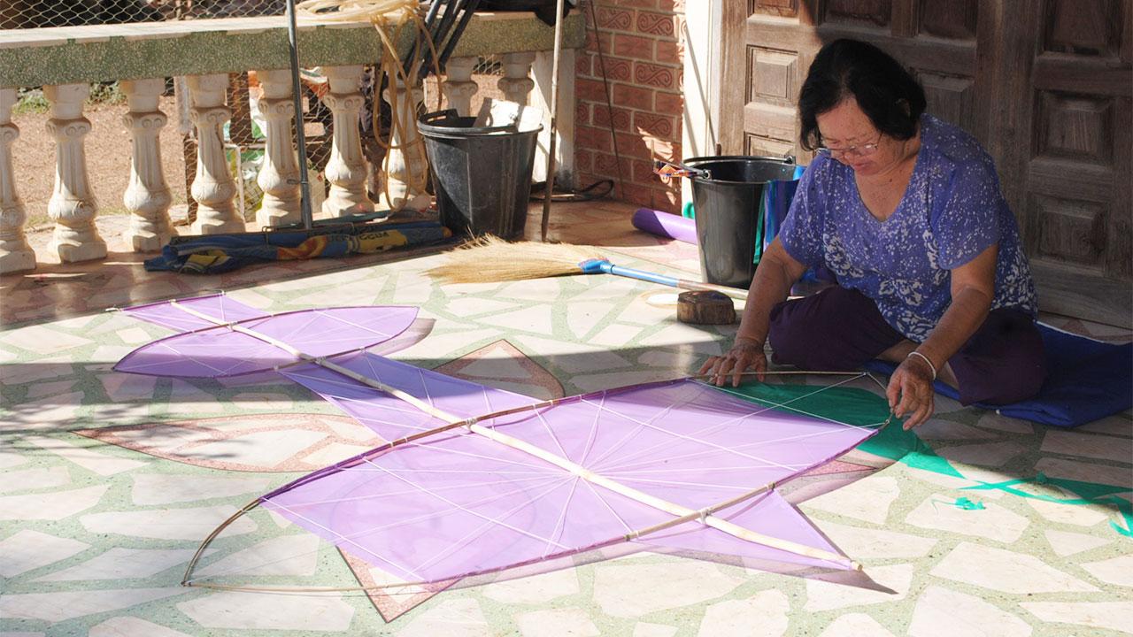 เมื่อเวลา 12.00 น. วันที่ 20 พ.ย. ผู้สื่อข่าวได้เดินทางไปยังบ้านเลขที่ 81 หมู่ 6 ต.วังใหญ่ อ.ศรีสำโรง จ.สุโขทัย ซึ่งเป็นบ้านของนายเสวิง เพ็ญเชื้อ อายุ 67 ปี และ นางสมศักดิ์ เพ็ญเชื้อ อายุ 65 ปี สองตายาย เมื่อไปถึงพบตาเสวิง กำลังนั่งเหลาไม้ไผ่เพื่อทำโครงว่าวอยู่ใต้ต้นไม้หน้าบ้าน ส่วนยายสมศักดิ์ กำลังสาละวนอยู่กับการทำผ้าพลาสติกสีสันต่างๆมาติดกับโครงว่าวไม้ไผ่