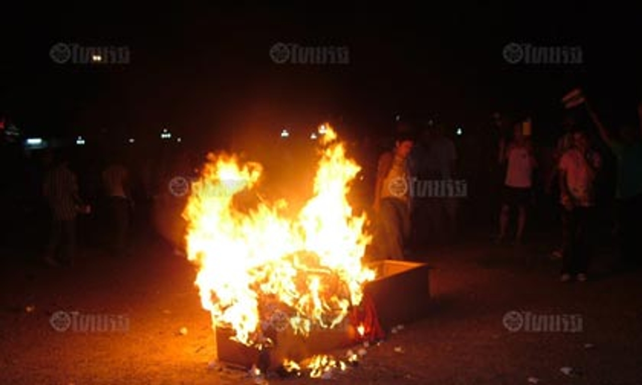 เสื้อแดงอุบลฯ กว่า 2,000 บุกบ้าน รมต.พม. ล้อมราชธานีอโศกซึ่งเป็นที่ตั้งของศูนย์เคลื่อนไหวกลุ่มคนเสื้อเหลือง ปราศรัยดุ คุมอารมณ์ไม่อยู่ปาอึ-ปลาร้า-นำ้แข็งใส่กันวุ่น เผาพริกเผาเกลือแช่ง "มาร์ค"
