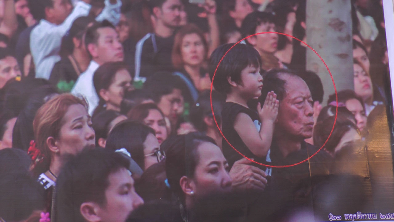 หนูน้อยวัย 3 ขวบ อยู่ที่แม่สอด จ.ตาก 1 ใน 9 ภาพแห่งความจงรักภักดี ที่ วธ.คัดเลือก นำมาจัดนิทรรศการ “ทรงสถิตในดวงใจไทยนิรันดร์” ชื่อ ด.ช.ภูมิทรัพย์ เนรกัณฐีสกุล ปู่อุ้มรอรับขบวนพระบรมศพ ถูกถ่ายภาพขณะกำลังพนมมือไหว้...