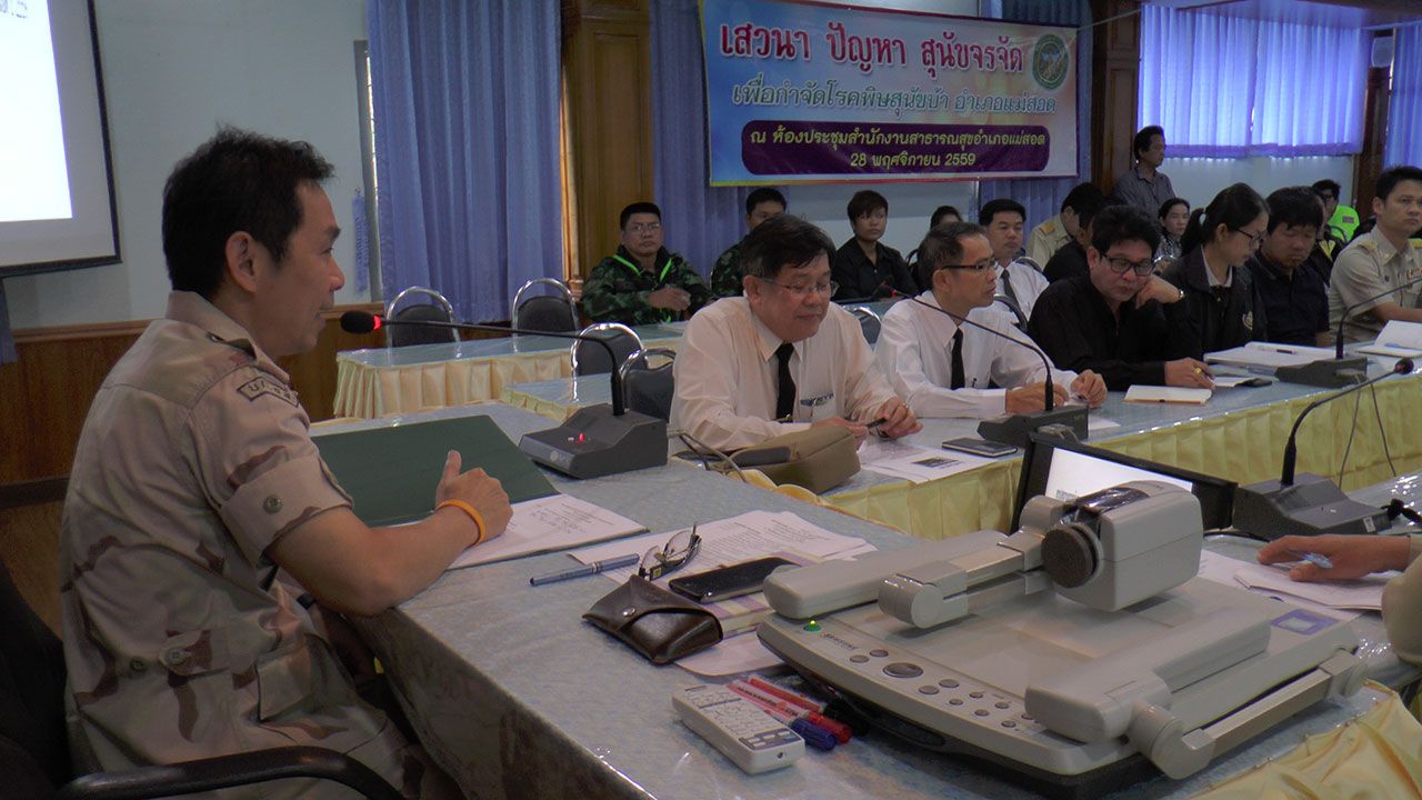 เมื่อวันที่ 28 พ.ย.59 นายธนยศ ปานขาว นายอำเภอแม่สอด พร้อมด้วยปศุสัตว์ จ.ตาก สาธารณสุข อ.แม่สอด โรงพยาบาลแม่สอด อปท.ทุกแห่ง ผู้นำชุมชน รวมถึงหน่วยงานที่เกี่ยวข้องได้รับฟังปัญหาและระดมความคิดเห็นเพื่อแก้ไขปัญหาสุนัขจรจัดและการระบาดของโรคพิษสุนัขบ้า
