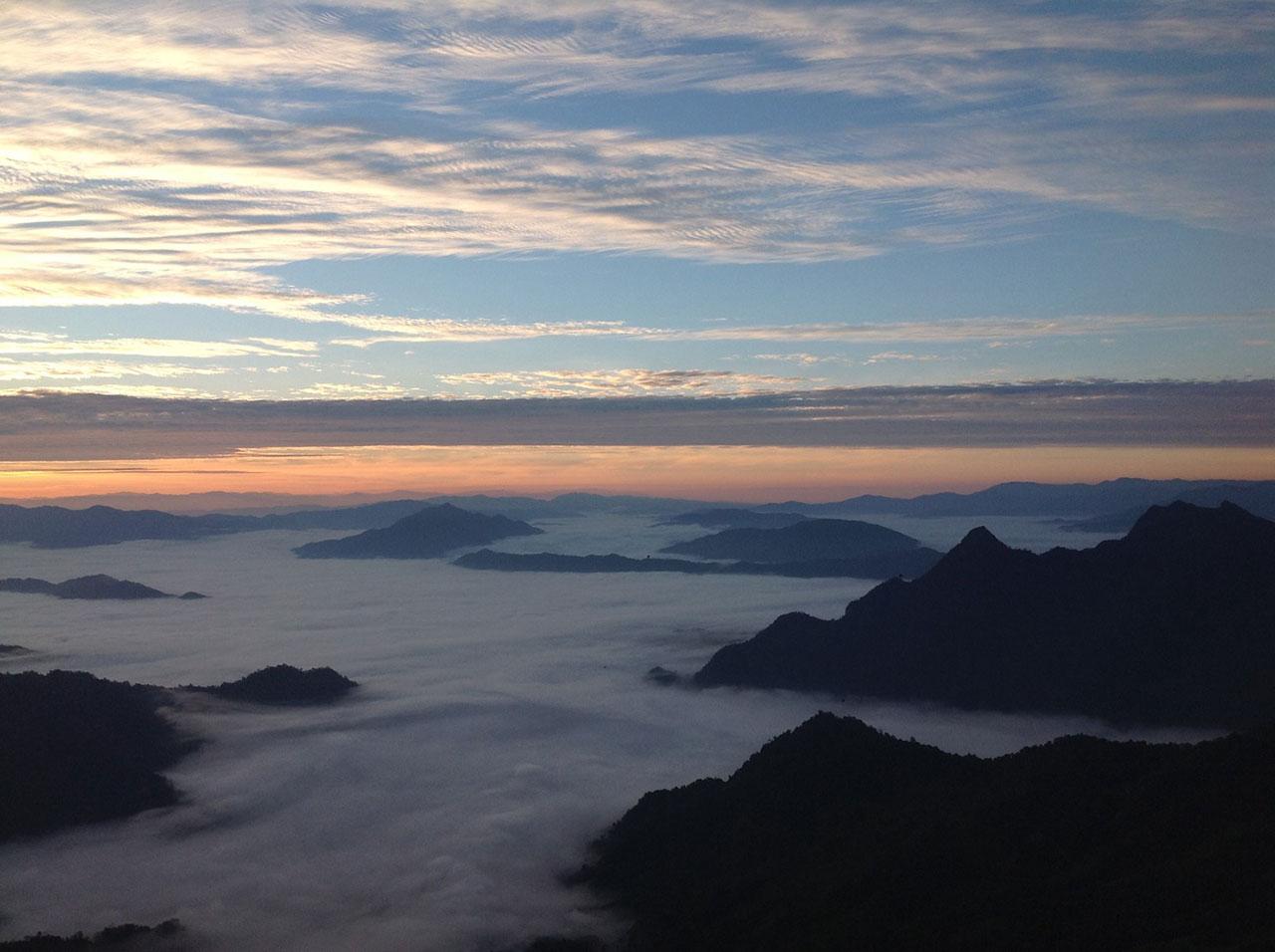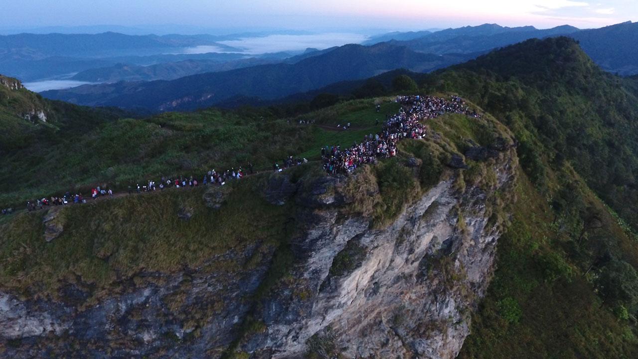 เมื่อวันที่ 5 ธ.ค.59 ผู้สื่อข่าวรายงานว่า ที่บริเวณยอดดอยภูชี้ฟ้า อ.เทิง จ.เชียงราย นักท่องเที่ยวจากทั่วสารทิศจำนวนกว่า 3,000 คน ใช้เวลาวันหยุดยาว 3 วัน เดินเท้าจากเชิงเขาขึ้นยอดดอยภูชี้ฟ้า โต้ลมหนาว ซึ่งวัดอุณหภูมิได้ที่ 8 องศาเซลเซียส เพื่อรอคอยชมพระอาทิตย์ขึ้นโผล่พ้นทะเลหมอก