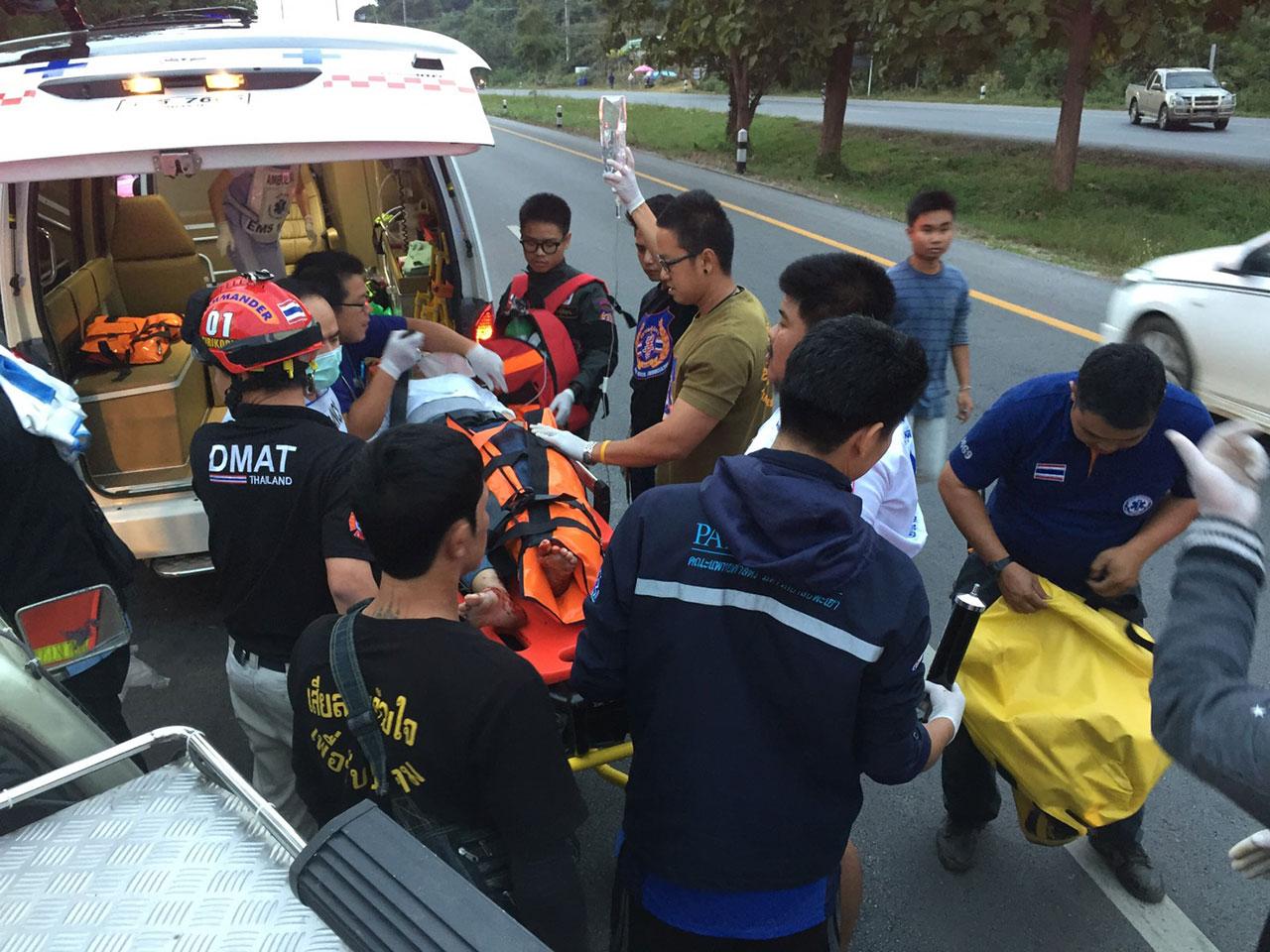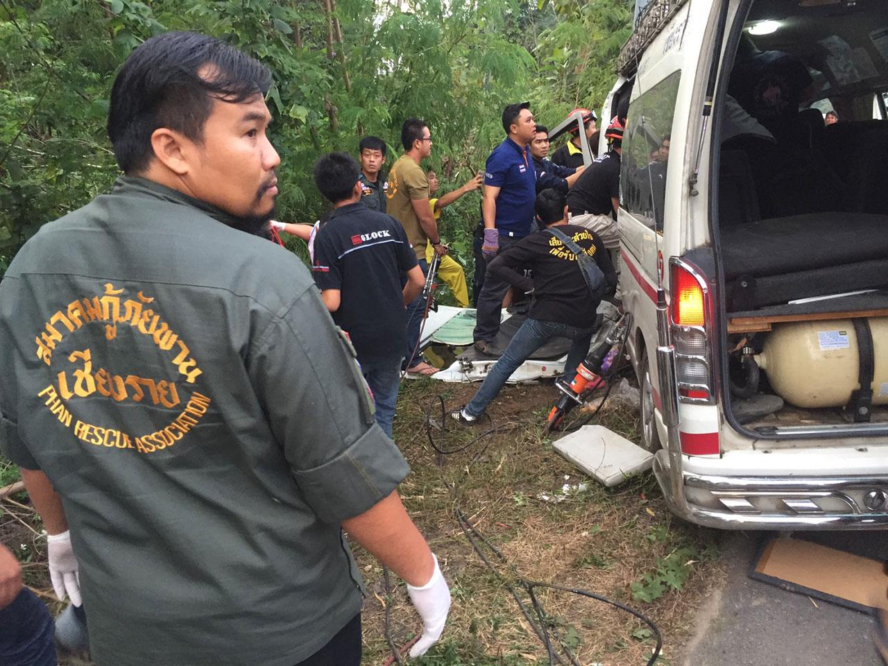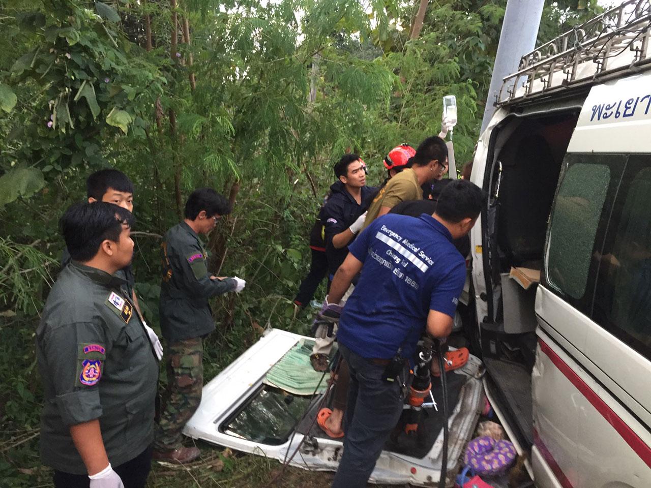 ทั้งนี้มีนายวิเชษฐ นันตา อายุ 37 ปี เป็นคนขับได้รับบาดเจ็บที่หน้าอกกระแทกพวงมาลัย ส่วนผู้โดยสารที่นั่งคู่กันมาชื่อ น.ส.สุมาจร ซอวัฒนะกุล อายุ 21 ปี ขาซ้ายหักถูกอัดก๊อบปี้ติดหน้ารถ กู้ภัยต้องใช้เครื่องมือตัดถ่างนำออกมา ส่วนภายในรถตู้มีผู้โดยสารได้รับบาดเจ็บ 9 ราย กู้ภัยพานได้นำส่งโรงพยาบาลพาน และโรงพยาบาลแม่ลาว