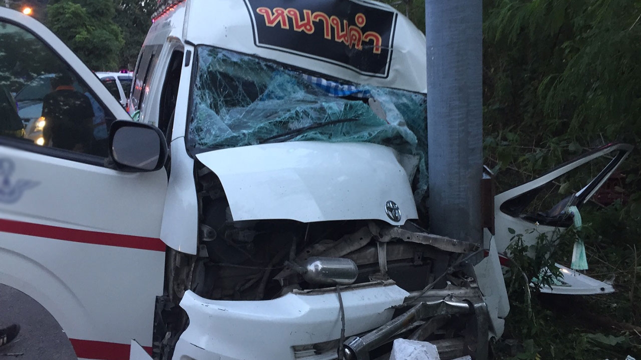 คนขับรถตู้โดยสารสายแพร่-เชียงราย เกิดหลับในระหว่างเข้าโค้งบนถนนพหลโยธินขาขึ้น หน้าโรงเรียนบ้านทรายขาว แล้วรถเสียหลักพุ่งลงข้างทางชนเสาป้ายบอกทางขนาดใหญ่ ผู้โดยสารเจ็บ 11 คน โชคดีไม่มีใครเสียชีวิต...