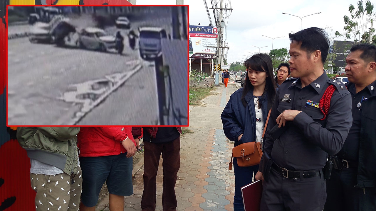 จากการสอบถามในเบื้องต้น และจากการดูภาพจากกล้องวงจรปิด ทางเจ้าหน้าที่ตำรวจพบว่า รถยนต์เก๋งยี่ห้อฮอนด้า รุ่นซิตี้ สีขาว ที่ขับมาโดยนายรัฐภูมิ อยู่ในเลนขวาสุด และเลนซ้ายมีรถยนต์เก๋งยี่ห้อนิสสัน รุ่นซันนี่ สีขาว ที่ขับโดยนายชม ซึ่งมีรถจักรยานยนต์ ที่ขับโดยนายเรวัตร ตามมาด้านท้าย ต่อมาได้มีรถยนต์กระบะยี่ห้อมิตซูบิชิ ที่ขับโดยนายณัฐพงษ์ ซึ่งเป็นเจ้าของร้านจำหน่ายรถมือสอง ได้ขับขี่มาด้วยความเร็ว และได้เข้าไปแทรกระหว่างกลางของรถยนต์เก๋งทั้งสองคัน ก่อนจะเสียหลักเฉี่ยวชนกับรถยนต์เก๋งยี่ห้อนิสสัน ที่อยู่ด้านซ้าย และรถเริ่มตะแคงด้านข้าง แล้วฟาดชนกับรถยนต์เก๋งยี่ห้อฮอนด้า ที่อยู่ด้านขวา ซึ่งในจังหวะที่ชนนั้น รถจักรยานยนต์ที่ขับตามรถยนต์เก๋งยี่ห้อนิสสันมาอย่างกระชั้นชิด จากการดูภาพก็ไม่ได้ขับเร็ว แต่เบรกไม่ทัน จึงถูกรถยนต์เก๋งยี่ห้อนิสสันเฉี่ยวชน จนทำให้รถเสียหลัก ซึ่งคนขับก็ได้กระเด็นตกจากรถพุ่งเข้าไปชนเสาไฟฟ้าข้างทางเสียชีวิตดังกล่าว