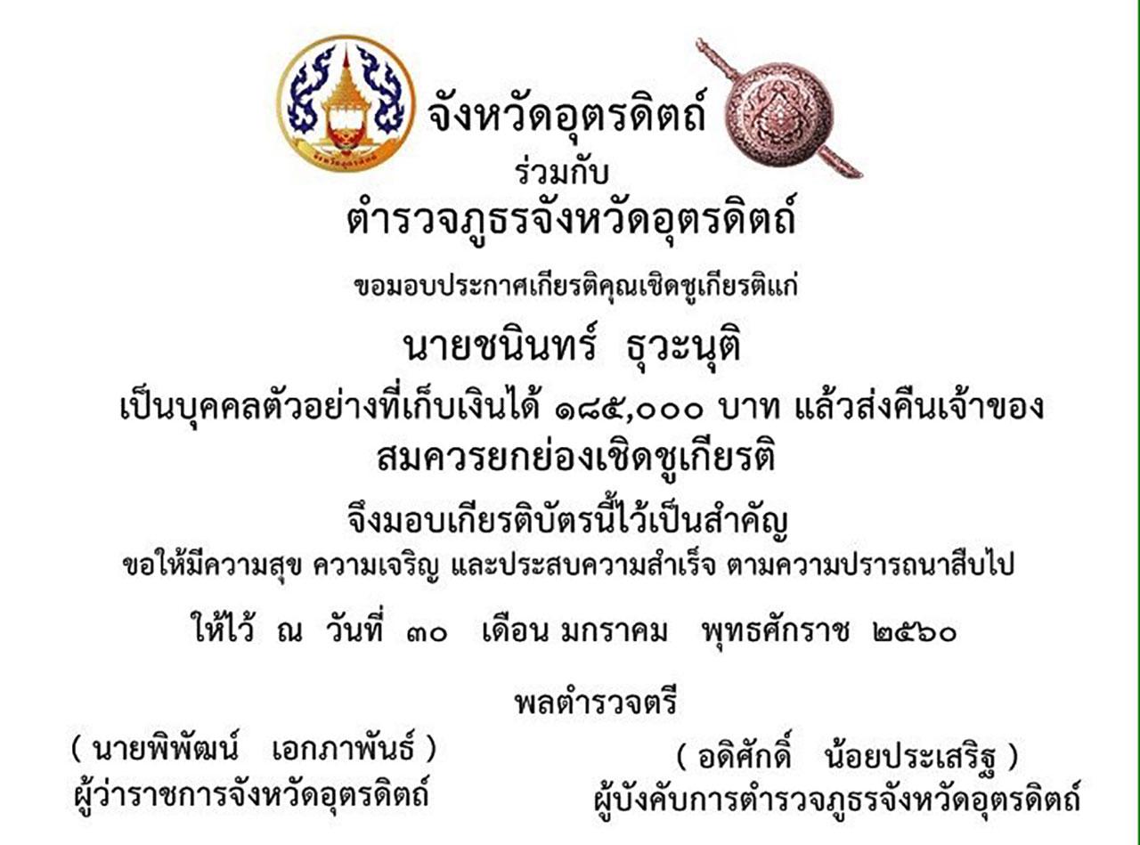 นายธวัชชัย กล่าวขอบคุณผู้บริหารของห้างสรรพสินค้าเทสโก้โลตัส สาขาอุตรดิตถ์ ที่อบรมพนักงาน และมีพนักงานที่เป็นแบบอย่างที่ดีแก่สังคม และอยากให้ทุกคนเป็นพลเมืองดีที่ทำดีแบบนี้ ส่วนนายชนินทร์ ที่เก็บเงินจำนวนดังกล่าวได้นั้น ทางจังหวัดอุตรดิตถ์ร่วมกับตำรวจภูธรจังหวัดเตรียมมอบประกาศเกียรติคุณเชิดชู เป็นบุคคลตัวอย่างที่เก็บเงินได้จำนวน 185,000 บาท แล้วคืนเจ้าของ สมควรยกย่องเชิดชูเกียรติ ในวันประชุมประจำเดือน ที่ห้องประชุมศิลาอาสน์ ศาลากลางจังหวัด ต่อหน้าหัวหน้าส่วนราชการ ซึ่ง นายพิพัฒน์ เอกภาพันธ์ ผู้ว่าราชการจังหวัดอุตรดิตถ์จะเป็นคนมอบด้วยตัวเอง” พ.ต.อ.ดิษยเดช พัชรภูวดล ผกก.สภ.เมือง กล่าว