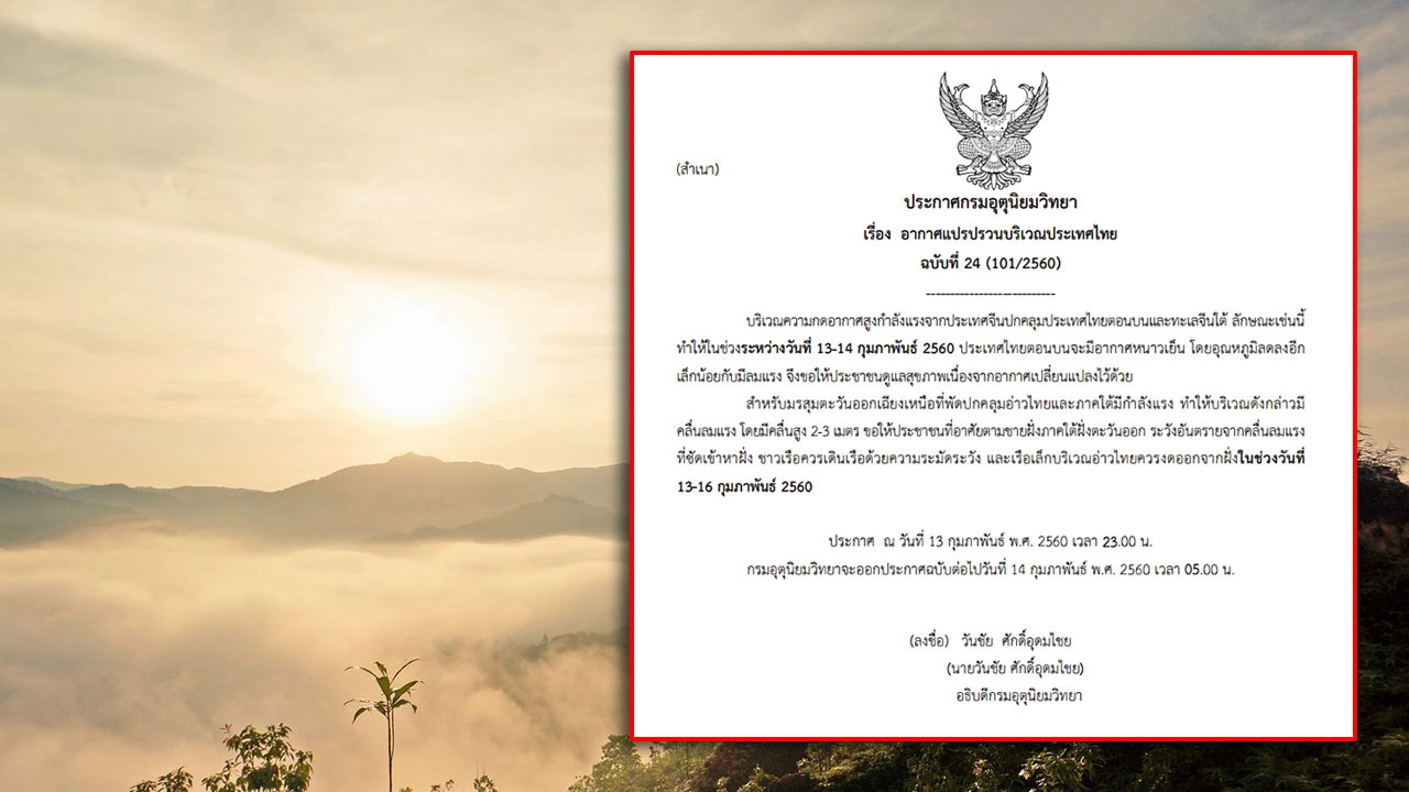 เมื่อเวลา 23.00 น. วันที่ 13 ก.พ. กรมอุตุนิยมวิทยา ออกประกาศฉบับที่ 24 เรื่อง ”อากาศแปรปรวนบริเวณประเทศไทย" ระบุว่า บริเวณความกดอากาศสูงกำลังแรงจากประเทศจีนปกคลุมประเทศไทยตอนบนและทะเลจีนใต้ ลักษณะเช่นนี้ทำให้ในช่วงระหว่างวันที่ 13-14 ก.พ. 2560 ประเทศไทยตอนบนจะมีอากาศหนาวเย็น โดยอุณหภูมิลดลงอีกเล็กน้อยกับมีลมแรง จึงขอให้ประชาชนดูแลสุขภาพเนื่องจากอากาศเปลี่ยนแปลงไว้ด้วย