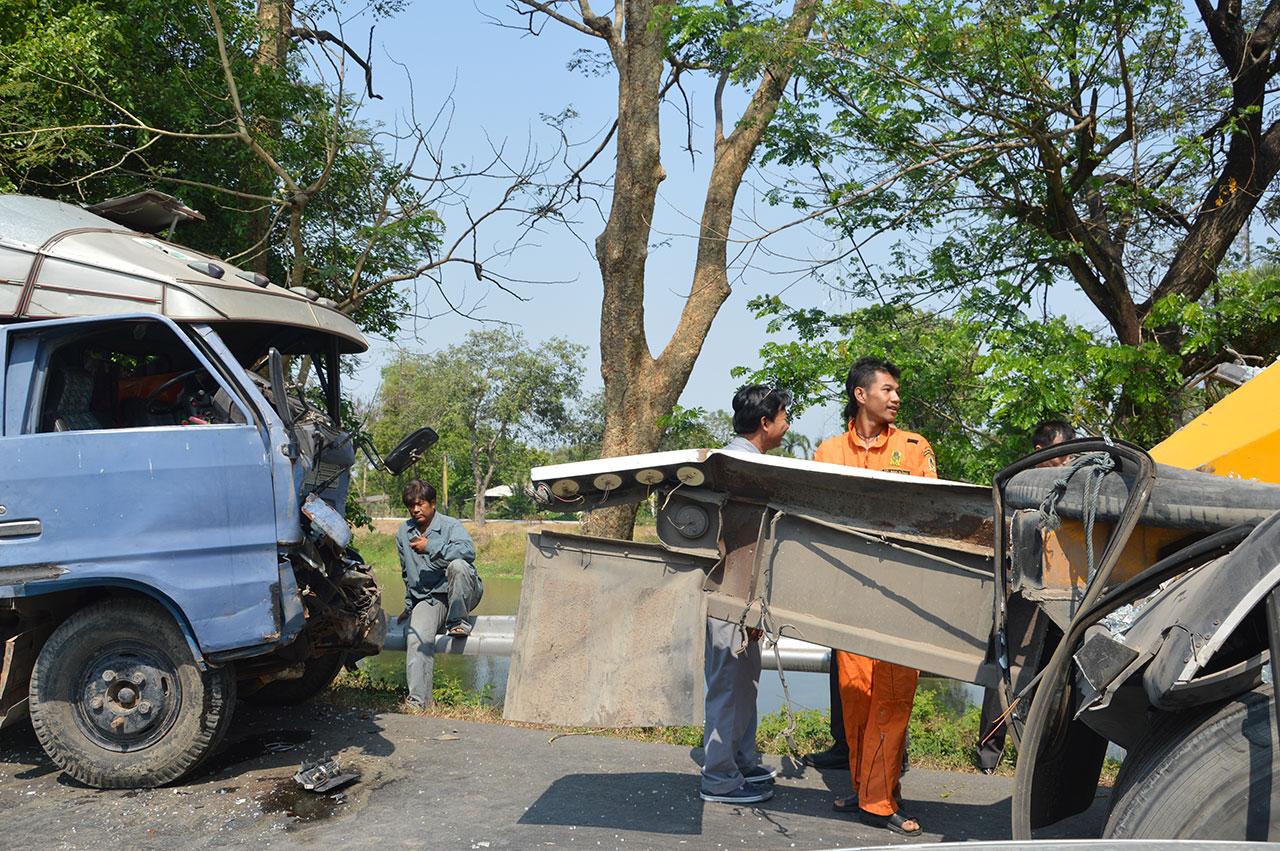 ที่จุดเกิดเหตุพบรถบรรทุกพ่วง ยี่ห้อฮีโน่ สีเหลือง หมายเลขทะเบียน 62-0585 กรุงเทพมหานคร ตัวพ่วง 62-0994 กรุงเทพมหานคร ถูกชนท้ายพังเสียหายจอดอยู่ริมถนน มีนายทรงฤทธิ์ โครตรักษา อายุ 53 ปี คนขับยืนรอเจ้าหน้าที่ ห่างกันเล็กน้อย พบรถหกล้อ ยี่ห้ออีซูซุ สีฟ้า หมายเลขทะเบียน 80 - 6176 นครนายก สภาพหน้ารถพังยับเยิน มีผู้ได้รับบาดเจ็บ 23 ราย ถูกนำตัวส่ง รพ.บ้านนา อาการสาหัส 3 คนทราบชื่อคือ นายอุดมศักดิ์ มณีดวง อายุ 17 ปี ขาข้างขวาหัก นายภาสกร กมลศิลา อายุ 17 ปี แขนข้างขวาหัก นายธนารุจน์ แป้นแก้ว อายุ 17 ปี ไหปลาร้าหัก นอกนั้นเคล็ดขัดยอก แผลถลอกบาดเจ็บเล็กน้อย แพทย์อนุญาตให้กลับบ้านได้
