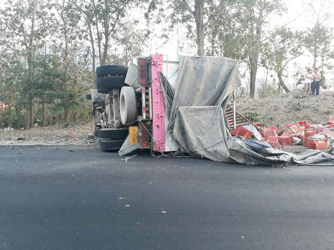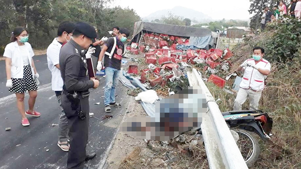 ที่เกิดเหตุพบรถบรรทุกสิบล้อยี่ห้ออีซูซุ สีขาว ทะเบียน 70-6348 เชียงราย บรรทุกลังพลาสติกใส่ลำไยมาเต็มคัน เสียหลักพลิกตะแคงอยู่ในช่องสวนทางลงเนิน ลังพลาสติกใส่ลำไยตกกระจายเกลื่อนถนน โดยมี นายพิษณุ แข็งฤทธิ์ อายุ 29 ปี บ้านเลขที่ 138 ม.1 ต.ดอนศิลา อ.เมืองเชียงราย คนขับ ได้รับบาดเจ็บเล็กน้อย ยืนรอเจ้าหน้าที่อยู่ในอาการตื่นตระหนก ส่วนคู่กรณีเป็นรถจักรยานยนต์ยามาฮ่า สีเขียว-ดำ ทะเบียน กนค 662 สุโขทัย โดยมีศพ นายปิ่น ประเสริฐศรี อายุ 66 ปี บ้านเลขที่ 35/10 ม.7 ต.เวียงมอก อ.เถิน จ.ลำปาง ผู้ขับขี่อัดติดอยู่กับรถจักรยานยนต์และเหล็กกั้นขอบทาง