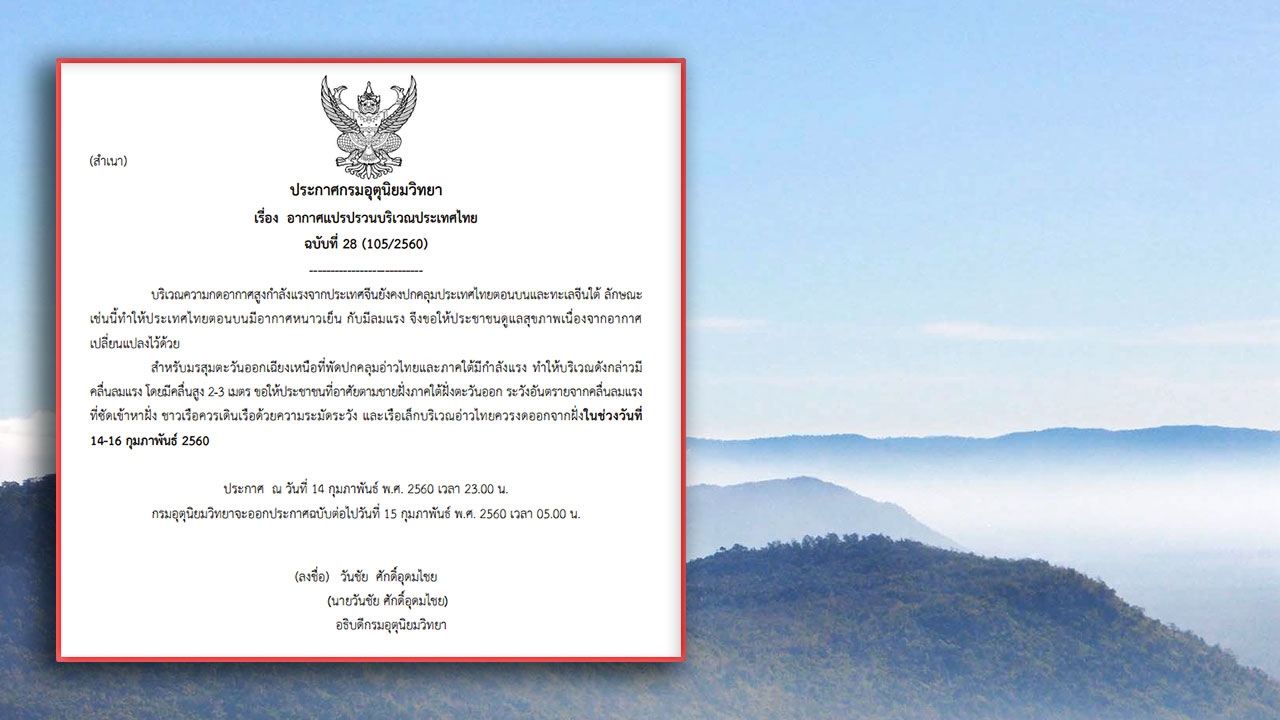 เมื่อเวลา 23.00 น. วันที่ 14 ก.พ. 2560 กรมอุตุนิยมวิทยา ออกประกาศ ฉบับที่ 28 เรื่อง ”อากาศแปรปรวนบริเวณประเทศไทย" ว่า บริเวณความกดอากาศสูงกำลังแรงจากประเทศจีนยังคงปกคลุมประเทศไทยตอนบนและทะเลจีนใต้ ลักษณะเช่นนี้ทำให้ประเทศไทยตอนบนมีอากาศหนาวเย็น กับมีลมแรง จึงขอให้ประชาชนดูแลสุขภาพเนื่องจากอากาศเปลี่ยนแปลงไว้ด้วย