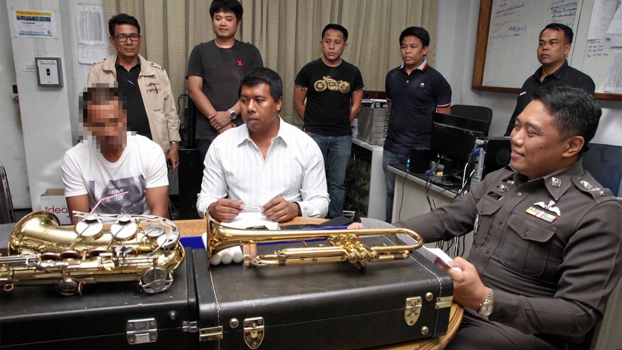 ตร.แถลงจับ นายสันติ เจ๊ะอาหลี อดีตนักมวยไทย พร้อมเครื่องดนตรีสากลที่ลักมาจากร้านอาหารนายธีรเดช หรืออาเล็ก เมธาวรายุทธ ดารานักแสดงชื่อดัง รับสารภาพผันตัวเองมาเป็นครูสอนมวยแต่รายได้ไม่พอใช้จึงเสพยาออกลักทรัพย์.