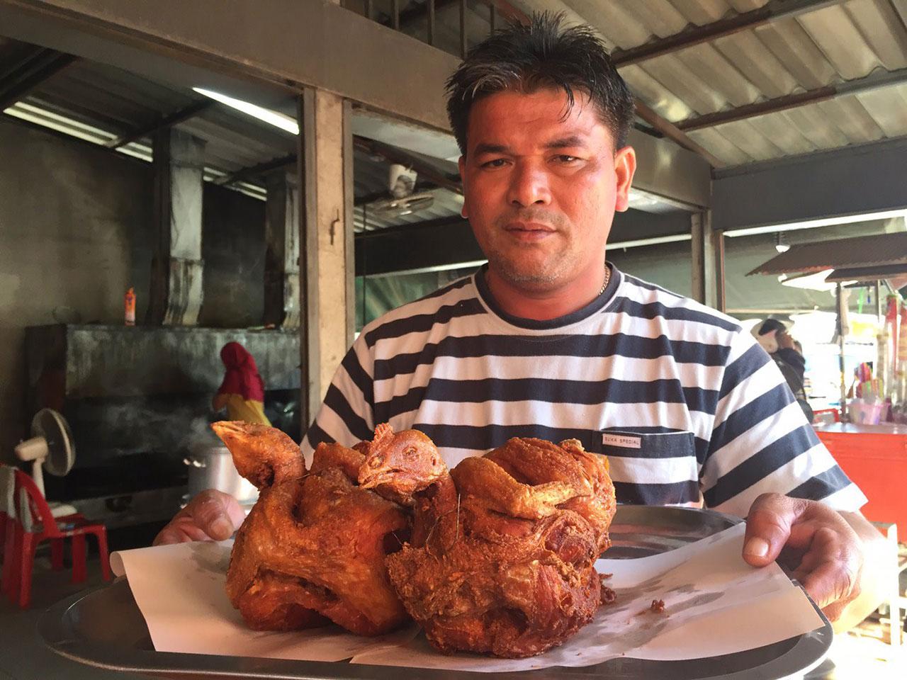 บังรูญ พ่อค้าไก่ทอดที่สุราษฎร์ฯ เกิดไอเดียจากวันตรุษจีนที่มีไก่เหลือเยอะ คิดสูตรหมัก แล้วนำลงทอดทั้งตัวจนลงตัวได้สูตรเด็ด ทอดออกมา หนังกรอบ เนื้อนุ่มสุกทั่วถึง เป็นของดีทีเด็ดของร้าน ลูกค้าอุดหนุนแน่นทุกวัน...