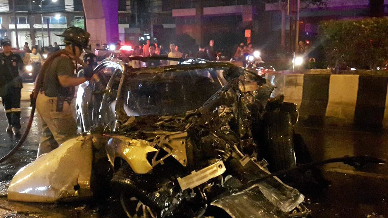 จนท.ระดมฉีดน้ำใส่รถเก๋งยี่ห้อบีเอ็มดับเบิลยู รุ่น 740 แอลไอ สีขาว ทะเบียน ญผ 1599 กรุงเทพมหานคร ถูกไฟเผาวอดทั้งคัน หลัง นายธนพิชญ์ ธัมมณัฏฐ์ อายุ 51 ปี ทำธุรกิจส่งออก ต่างประเทศ ขับชนแท่งปูน แบริเออร์กั้นกลางถนน รัชดาภิเษกบาดเจ็บหมดสติ คาพวงมาลัย ถูกช่วยออก มาทันก่อนไฟไหม้ คาดหลับในหรือขับเร็วเสียหลัก.