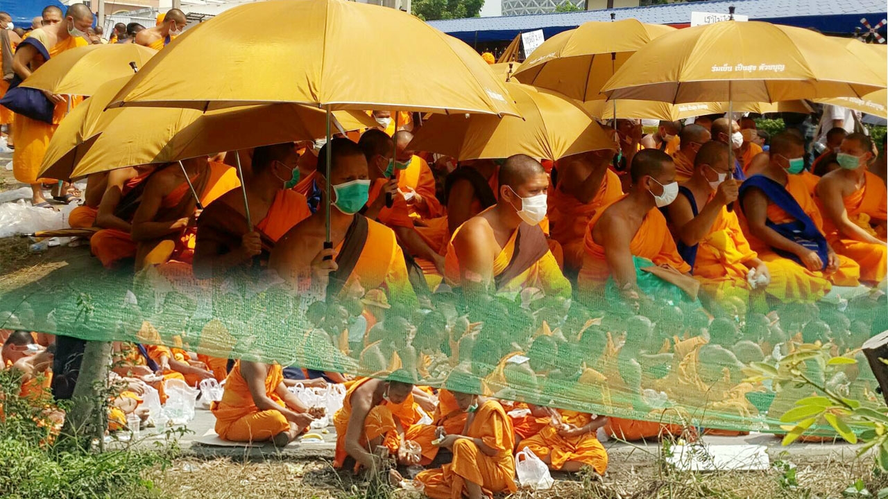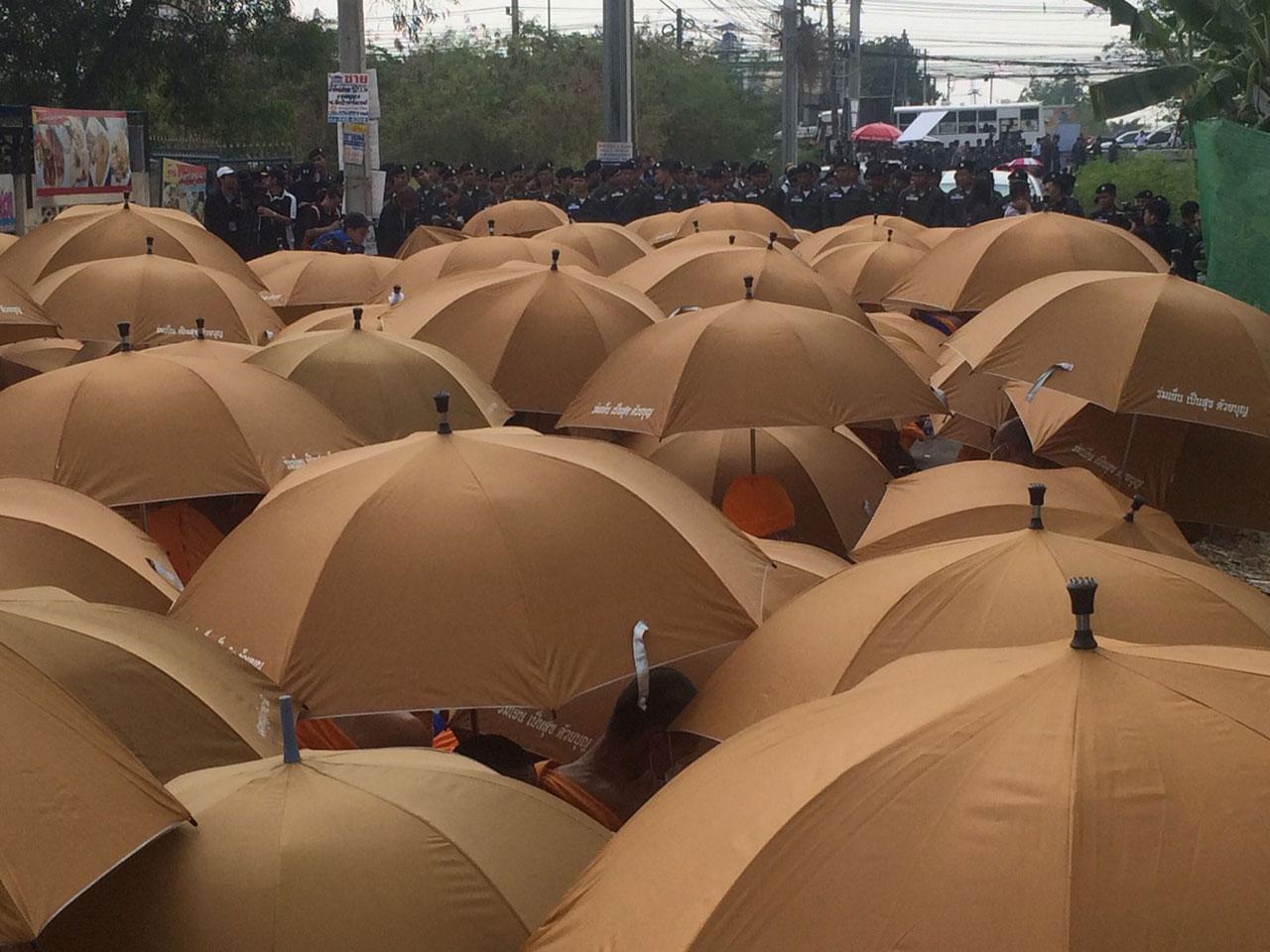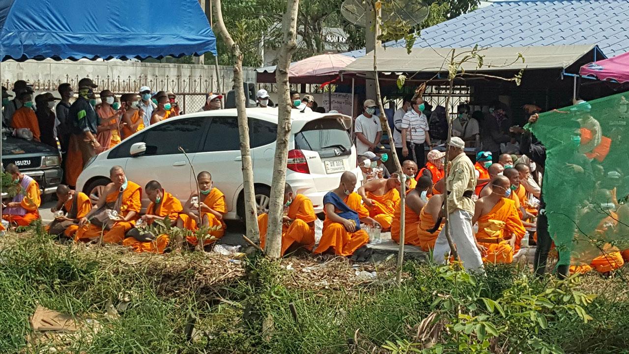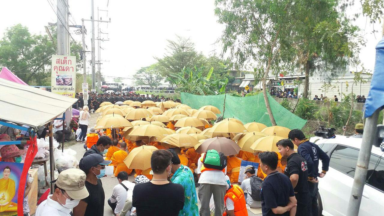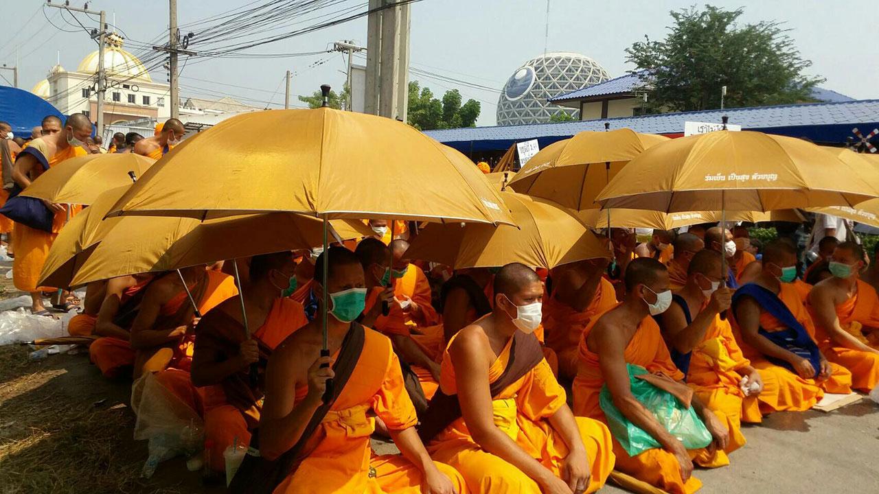 เวลา 11.00 น.วันที่ 20 ก.พ. ผู้สื่อข่าวรายงานบรรยากาศบริเวณวัดพระธรรมกาย ที่ถนนปากซอยคลองแอน ศิษยานุศิษย์ที่เป็นพระสงฆ์นั่งปักหลักยึดพื้นที่และกดดันเจ้าหน้าที่ ได้ทยอยผลัดเปลี่ยนกันไปรับภัตตาหารเพล ส่วนหนึ่งนั่งฉันกลางแดด ขณะที่ส่วนหนึ่งนำร่มมากาง นั่งอยู่กลางถนนเหมือนเดิม